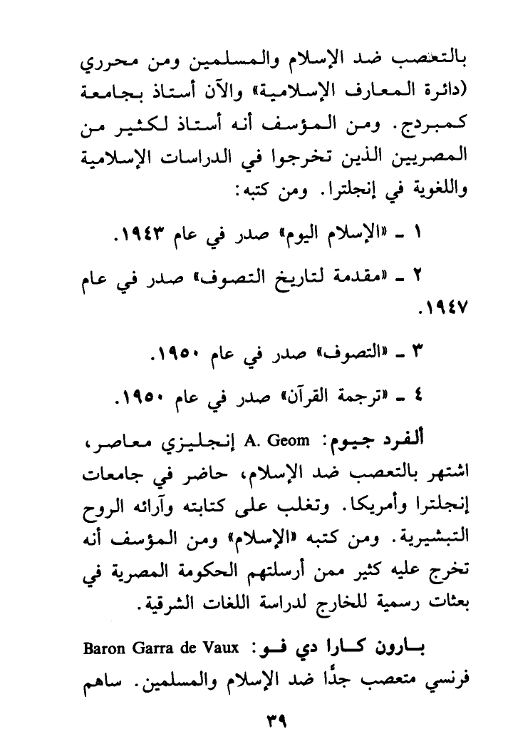 ألفرد جيوم: A. Geom انجليزي معاصر، اشتهر بالتعصب ضد الإسلام. حاضر في جامعات انجلترا وأمريكا. وَتَغْلُبُ على كتابته وآرائه الروح التبشيرية. ومن كتبه " الإسلام " ومن المؤسف أنه تَخَرَّجَ عليه كثير مِمَّنْ أرسلتهم الحكومة المصرية في بعثات رسمية للخارج لدراسة اللغات الشرقية.