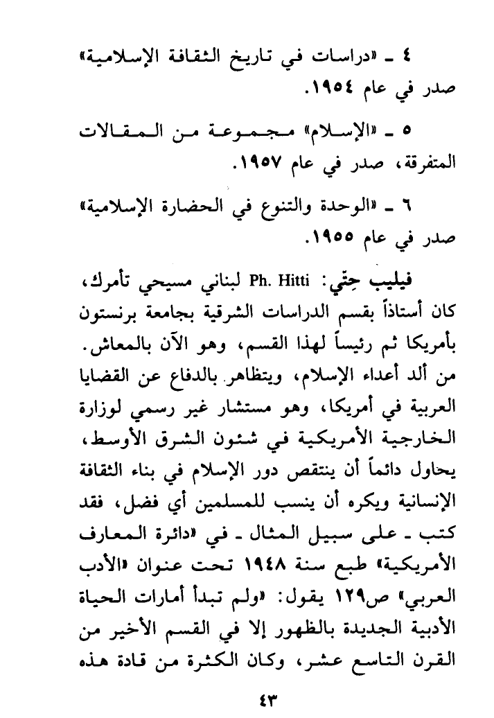 فيليب حِتِّي: Ph. Hitti لبناني مسيحي تأمرك، كان أستاذاً بقسم الدراسات الشرقية بجامعة برنستون بأمريكا ثم رئيساً لهذا القسم، وهو الآن بالمعاش. من أَلَدِّ أعداء الإسلام، ويتظاهر بالدفاع عن القضايا العربية في أمريكا، وهو مستشار غير رسمي لوزارة الخارجية الأمريكية في شؤون الشرق الأوسط، يحاول دائماً أنْ ينتقص دور الإسلام في بناء الثقافة الانسانية ويكره أنْ ينسب للمسلمين أي فضل، فقد كتب - على سبيل المثال - في " دائرة المعارف الأمريكية " طبع سنة 1948م تحت عنوان " الأدب العربي " ص 129 يقول: «ولم تبدأ أمارات الحياة الأدبية الجديدة بالظهور إلاَّ في القسم الأخير من القرن التاسع عشر، وكان الكثرة من قادة هذه