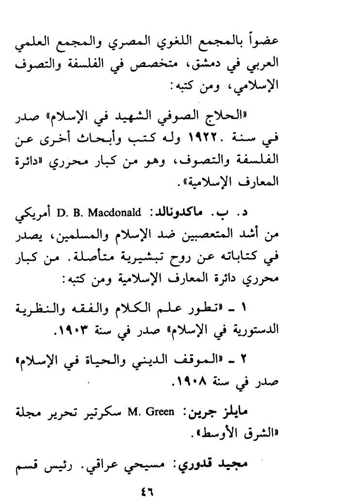 د. ب. ماكدونالد: D.B. Macdonald أمريكي من أشد المتعصبين ضد الإسلام والمسلمين، يصدر في كتاباته عن روح تبشيرية متأصلة. من كبار مُحَرِّرِي " دائرة المعارف الإسلامية " ومن كتبه: