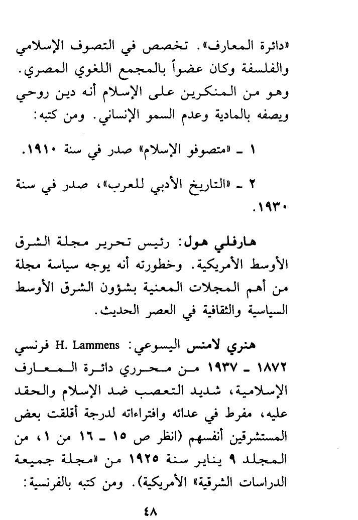 هنري لامنس اليسوعي: H. Lammens فرنسي 1872 - 1937م من مُحَرِّرِي "دائرة المعارف الإسلامية "، شديد التعصب ضد الإسلام والحقد عليه، مفرط في عدائه وافتراءاته لدرجة أقلقت بعض المُسْتَشْرِقِينَ أنفسهم أنظر ص 15 - 16 من 1،من المجلد 9 يناير سَنَةَ 1925م من " مجلة جمعيَّة الدراسات الشرقية " الأمريكية ومن كتبه بالفرنسية: