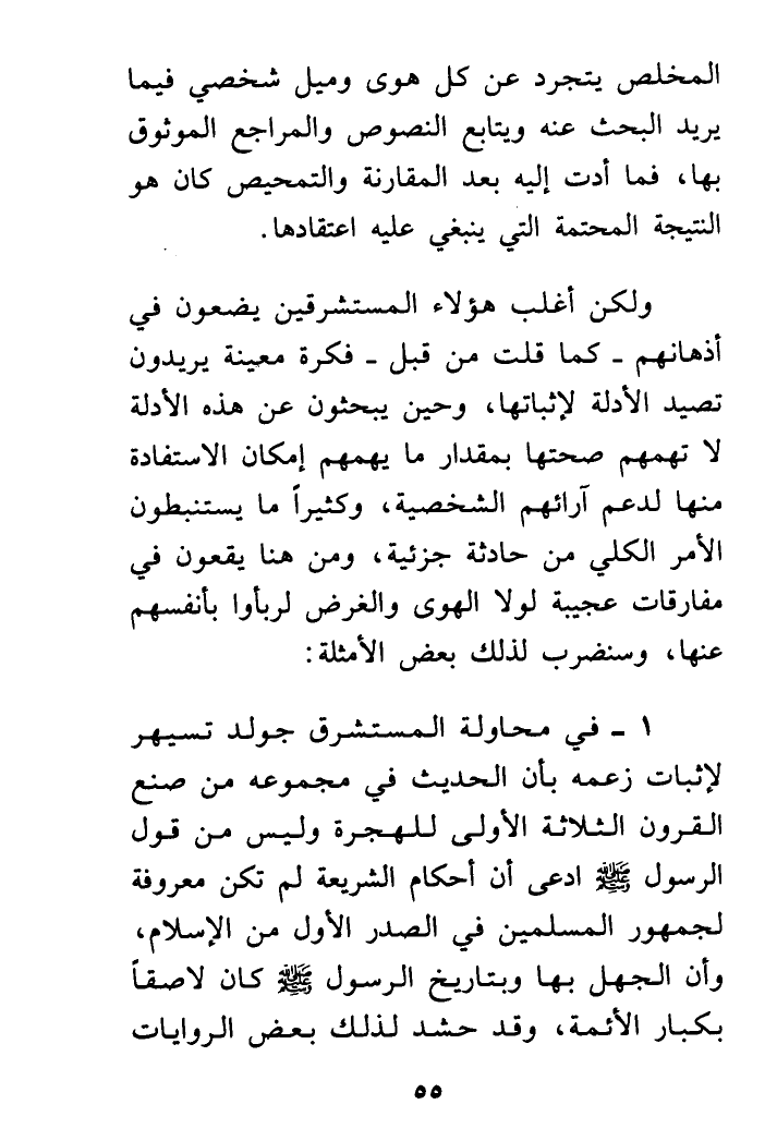 المخلص يتجرَّد عن كل هوى وميل شخصي فيما يريد البحث عنه ويتابع النصوص والمراجع الموثوق بها، فما أدت إليه بعد المقارنة والتمحيص كان هو النتيجة المحتمة التي ينبغي عليه اعتقادها. ولكن أغلب هؤلاء المُسْتَشْرِقِينَ يضعون في أذهانهم - كما قلت من قَبْلُ - فكرة معيَّنة يريدون تَصَيُّدَ الأدلَّة لإثباتها، وحين يبحثون عن هذه الأدلَّة لا تهمهم صِحَّتُهَا بمقدار ما يهمهم إمكان الاستفادة منها لدعم آرائهم الشخصية، وكثيراً ما يستنبطون الأمر الكلي من حادثة جزئية، ومن هنا يقعون في مفارقات عجيبة لولا الهوى والغرض لربأوا بأنفسهم عنها، وسنضرب لذلك بعض الأمثلة: