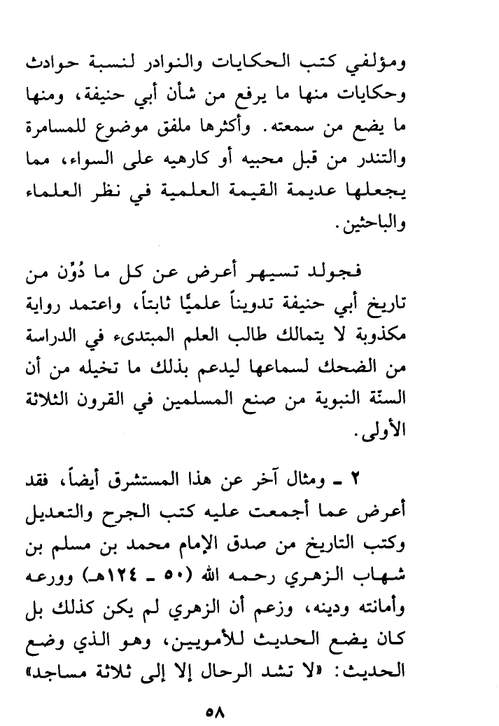 2 - ومثال آخر عن هذا المستشرق أيضاً، فقد أعرض عَمَّا أجمعت عليه كتب الجرح والتعديل وكتب التاريخ من صدق الإمام محمد بن مسلم بن شهاب الزُهري - رَحِمَهُ اللهُ - (50 - 124 هـ) وَوَرَعِهِ وأمانته ودينه، وزعم أنَّ الزهري لم يكن كذلك بل كان يضع الحديث للأمويِّين، وهو الذي وضع الحديث: «لاَ تُشَدُّ الرِّحَالُ إِلاَّ إِلَى ثَلاَثَةِ مَسَاجِدَ»