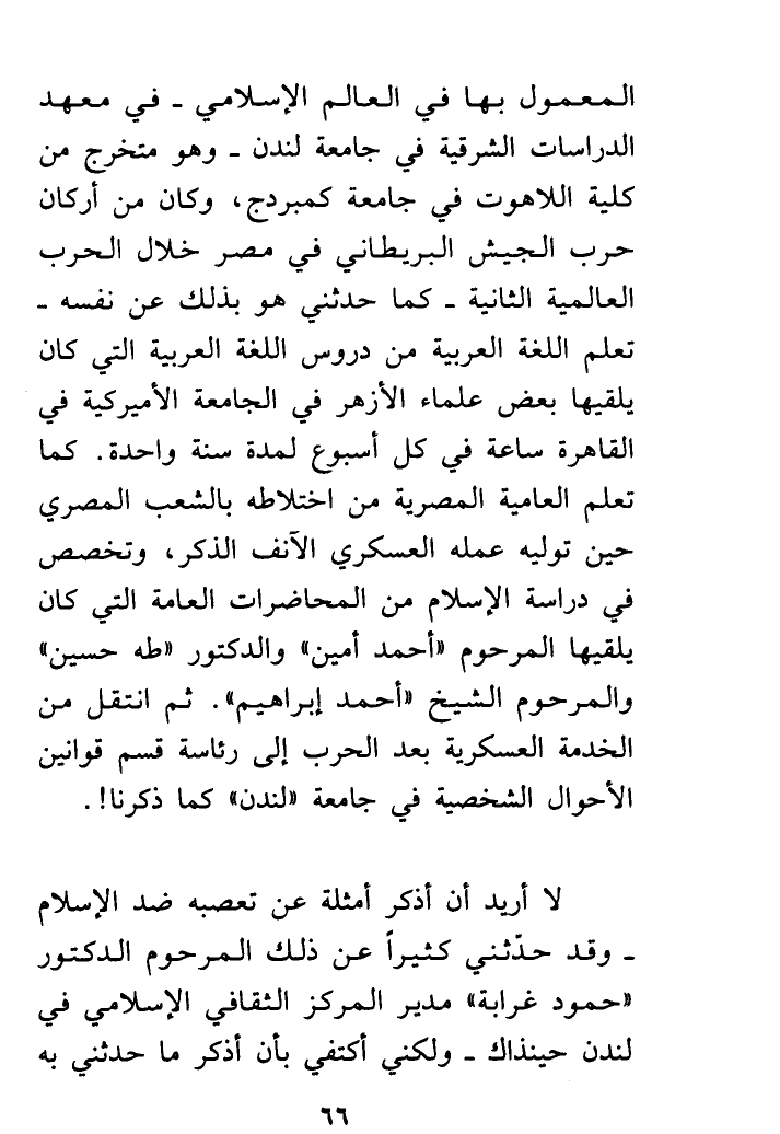 المعمول بها في العالم الإسلامي - في معهد الدراسات الشرقية في جامعة لندن - وهو متخرج من كلية اللاهوت في جامعة كمبردج، وكان من أركان حرب الجيش البريطاني في مصر خلال الحرب العالمية الثانية - كما حَدَّثَنِي هو بذلك عن نفسه - تعلم اللغة العربية من دروس اللغة العربية التي كان يلقيها بعض علماء الأزهر في الجامعة الأميركية في القاهرة ساعة في كل أسبوع لمدة سَنَةٍ واحدة. كما تعلم العامية المصرية من اختلاطه بالشعب المصري حين توليه عمله العسكري الآنف الذكر، وَتَخَصَّصَ في دراسة الإسلام من المحاضرات العامة التي كان يلقيها المرحوم «أحمد أمين» والدكتور «طه حسين» والمرحوم الشيخ «أحمد إبراهيم». ثم انتقل من الخدمة العسكرية بعد الحرب إلى رئاسة قسم قوانين الأحوال الشخصية في جامعة «لندن» كما ذكرنا!. لا أريد أنْ أذكر أمثلة عن تعصبه ضد الإسلام - وقد حَدَّثَنِي كثيراً عن ذلك المرحوم الدكتور «حمود غرابة» مدير المركز الثقافي الإسلامي في لندن حينذاك - ولكني أكتفي بأنْ أذكر ما حَدَّثَنِي به