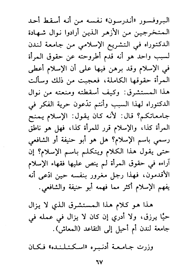البروفسور «أندرسون» نفسه من أنه أسقط أحد المُتَخَرِّجِينَ من الأزهر الذين أرادوا نوال شهادة الدكتوراه في التشريع الإسلامي من جامعة لندن لسبب واحد هو أنه قدم أطروحته عن حقوق المرأة في الإسلام وقد برهن فيها على أنَّ الإسلام أعطى المرأة حقوقها الكاملة، فعجبت من ذلك وسألت هذا المستشرق: «وكيف أسقطته ومنعته من نوال الدكتوراه لهذا السبب وأنتم تدّعون حرية الفكر في جامعاتكم؟»، قال: «لأنه كان يقول: الإسلام يمنح المرأة كذا، والإسلام قَرَّرَ للمرأة كذا، فهل هو ناطق رسمي باسم الإسلام؟ هل هو أبو حنيفة أو الشافعي حتى يقول هذا الكلام ويتكلم باسم الإسلام؟ إن آراءه في حقوق المرأة لم يَنُصَّ عليها فقهاء الإسلام الأقدمون، فهذا رجل مغرور بنفسه حين ادّعى أنه يفهم الإسلام أكثر مِمَّا فهمه أبو حنيفة والشافعي». هذا هو كلام هذا المستشرق الذي لا يزال حيّاً يرزق، ولا أدري إنْ كان لا يزال في عمله في جامعة لندن أم أُحِيلَ إلى التقاعد (المعاش). وَزُرْتُ جامعة أدنبره «اسكتلنده» فكان
