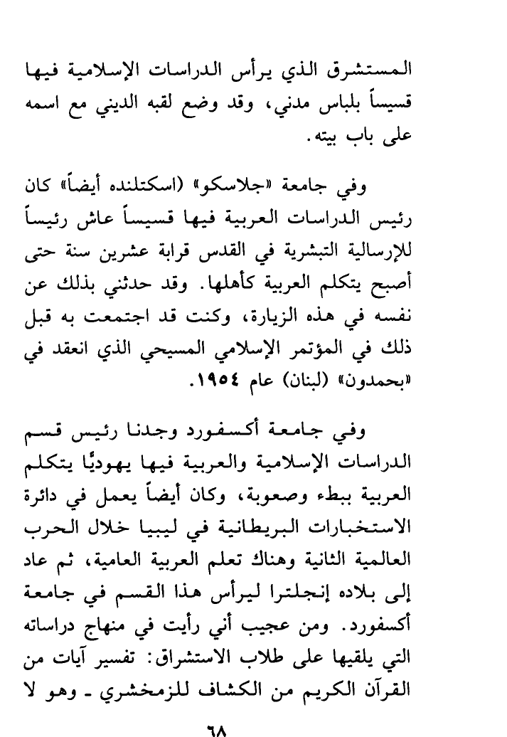 المستشرق الذي يرأس الدراسات الإسلامية فيها قِسِّيساً بلباس مدني، وقد وضع لقبه الديني مع اسمه على باب بيته. وفي جامعة «جلاسكو» (اسكتلنده أيضاً) كان رئيس الدراسات العربية فيها قِسِّيساً عاش رئيساً للإرسالية التبشيرية في القدس قرابة عشرين سَنَةً حتى أصبح يتكلم العربية كأهلها، وقد حَدَّثَنِي بذلك عن نفسه في هذه الزيارة، وكنت قد اجتمعت به قبل ذلك في المؤتمر الإسلامي المسيحي الذي انعقد في «بحمدون» (لبنان) عام 1954 م. وفي جامعة أكسفورد وجدنا رئيس قسم الدراسات الإسلامية والعربية فيها يهوديّاً يتكلم العربية ببطء وصعوبة، وكان أيضاً يعمل في دائرة الاستخبارات البريطانية في ليبيا خلال الحرب العالمية الثانية وهناك تعلم العربية العامية، ثم عاد إلى بلاده إنجلترا ليرأس هذا القسم في جامعة أكسفورد. ومن عجيب أني رأيت في منهاج دراساته التي يلقيها على طلاب الاستشراق: تفسير آيات من القرآن الكريم من " الكشاف " للزمخشري - وهو لا