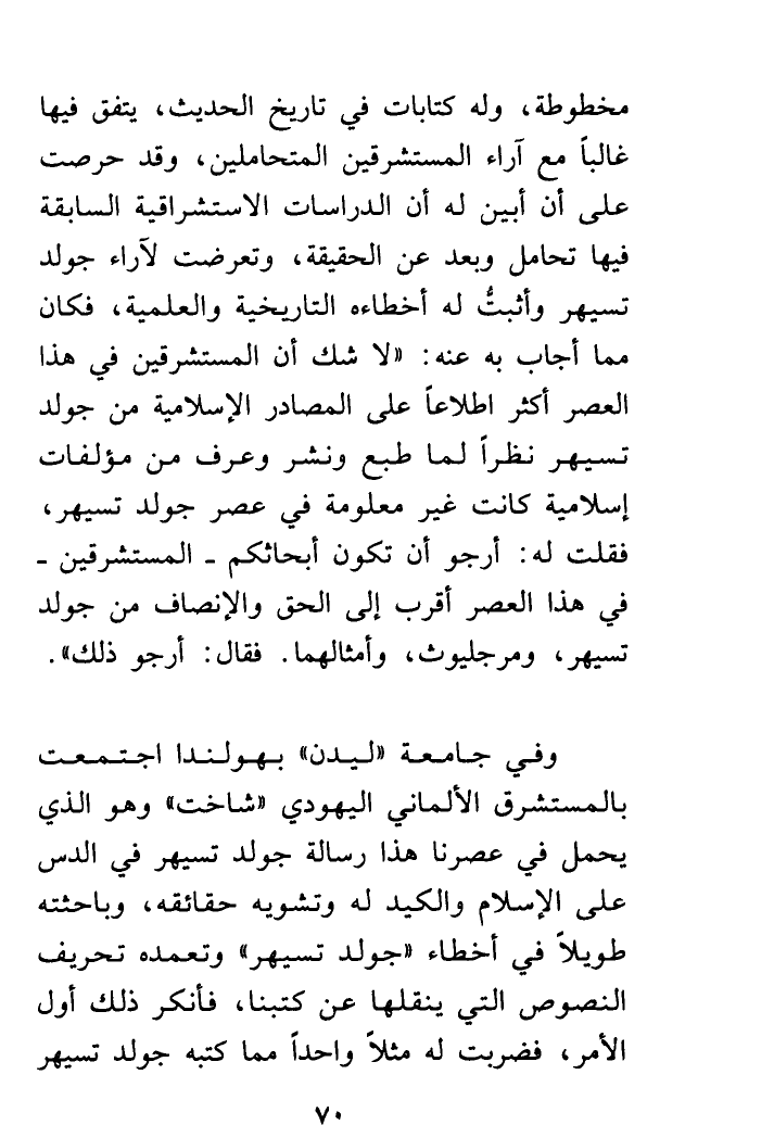 مخطوطة، وله كتابات في تاريخ الحديث، يتفق فيها غالباً مع آراء المُسْتَشْرِقِينَ المتحاملين، وقد حرصت على أنْ أُبَيِّنَ له أنَّ الدراسات الاستشراقية السابقة فيها تحامل وبُعْدٌ عن الحقيقة، وَتَعَرَّضْتُ لآراء جولدتسيهر وأثبتُّ له أخطاءه التَارِيخِيَّةِ وَالعِلْمِيَّةِ، فكان مِمَّا أجاب به عنه: «لا شك أنَّ المُسْتَشْرِقِينَ في هذا العصر أكثر اطِّلاَعاً على المصادر الإسلامية من جولدتسيهر نظراً لما طبع ونشر وعرف من مؤلفات إسلامية كانت غير معلومة في عصر جولدتسيهر»، فقلت له: «أرجو أنْ تكون أبحاثكم - المُسْتَشْرِقِينَ - في هذا العصر أقرب إلى الحق والإنصاف من جولدتسيهر، ومرجليوث، وأمثالهما». فقال: «أرجو ذلك». وفي جامعة "ليدن" بهولندا اجتمعت بالمستشرق الألماني اليهودي " شاخت " وهو الذي يحمل في عصرنا هذا رسالة جولدتسيهر في الدَسِّ على الإسلام والكيد له وتشويه حقائقه، وَبَاحَثْتُهُ طويلاً في أخطاء جولدتسيهر وَتَعَمُّدِهِ تحريف النصوص التي ينقلها عن كتبنا، فأنكر ذلك أول الأمر، فضربت له مثلاً واحداً مِمَّا كتبه جولدتسيهر