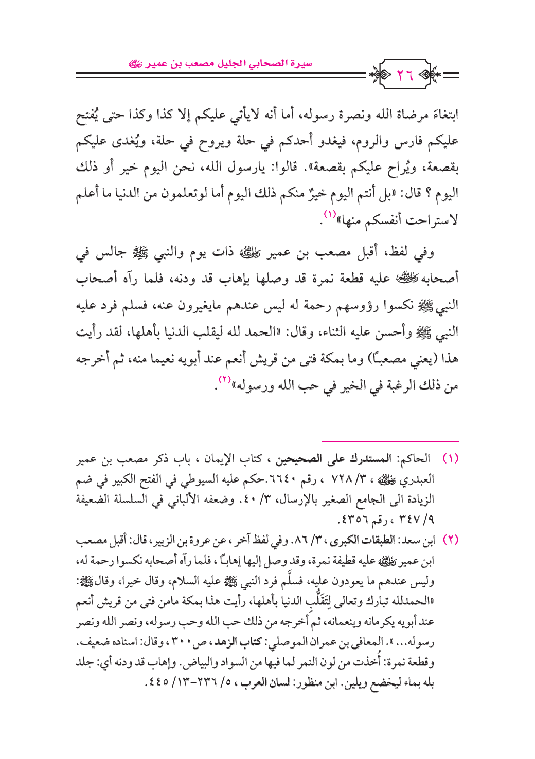 (¬2) ابن سعد: الطبقات الكبرى , 3/ 86. وفي لفظ آخر , عن عروة بن الزبير، قال: أقبل مصعب بن عمير - رضي الله عنه - عليه قطيفة نمرة، وقد وصل إليها إهاباً، فلما رآه أصحابه نكسوا رحمة له، وليس عندهم ما يعودون عليه، فسلَّم فرد النبي - صلى الله عليه وسلم - عليه السلام، وقال خيرا، وقال - صلى الله عليه وسلم -: «الحمد لله تبارك وتعالى لِتَقَلُّبِ الدنيا بأهلها، رأيت هذا بمكة ما من فتى من قريش أنعم عند أبويه يكرمانه وينعمانه، ثم أخرجه من ذلك حب الله وحب رسوله، ونصر الله ونصر رسوله ...». المعافى بن عمران الموصلي: كتاب الزهد , ص300 , وقال: اسناده ضعيف. وقطعة نمرة: أُخذت من لون النمر لما فيها من السواد والبياض. وإهاب قد ودنه أي: جلد بله بماء ليخضع ويلين. ابن منظور: لسان العرب , 5/ 236 - 13/ 445.