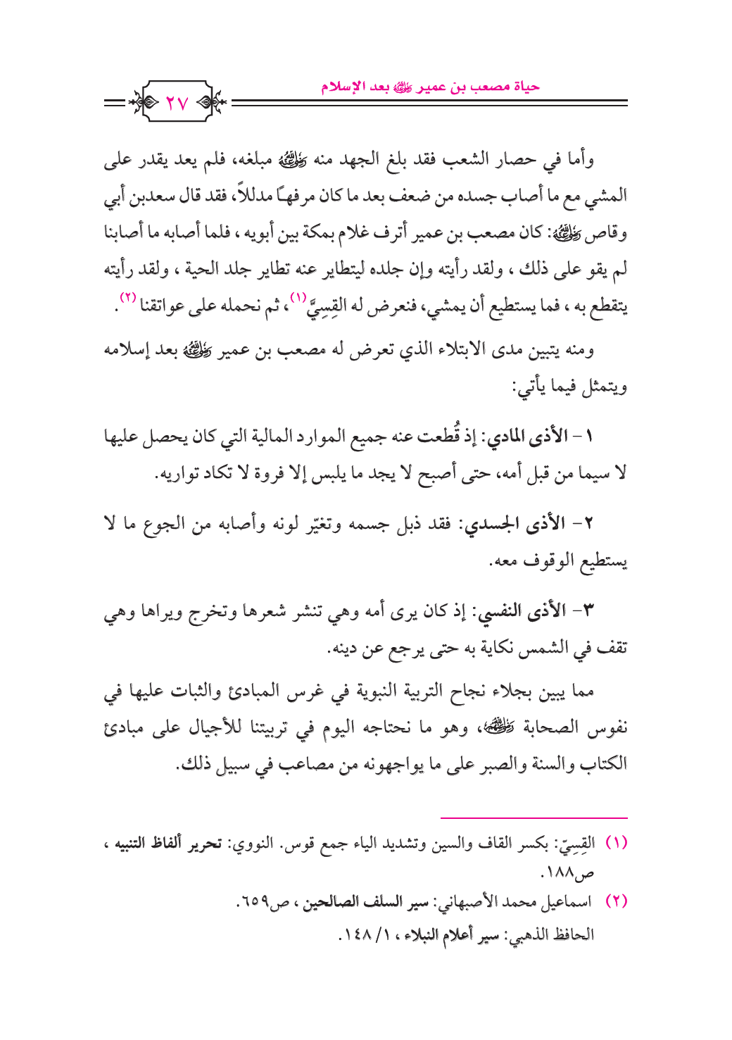 وأما في حصار الشعب فقد بلغ الجهد منه - رضي الله عنه - مبلغه , فلم يعد يقدر على المشي مع ما أصاب جسده من ضعف بعد ما كان مرفهاً مدللاً ,فقد قال سعد بن أبي وقاص - رضي الله عنه -: كان مصعب بن عمير أترف غلام بمكة بين أبويه، فلما أصابه ما أصابنا لم يقو على ذلك، ولقد رأيته وإن جلده ليتطاير عنه تطاير جلد الحية، ولقد رأيته يتقطع به، فما يستطيع أن يمشي، فنعرض له القِسِيَّ (¬1)، ثم نحمله على عواتقنا (¬2).