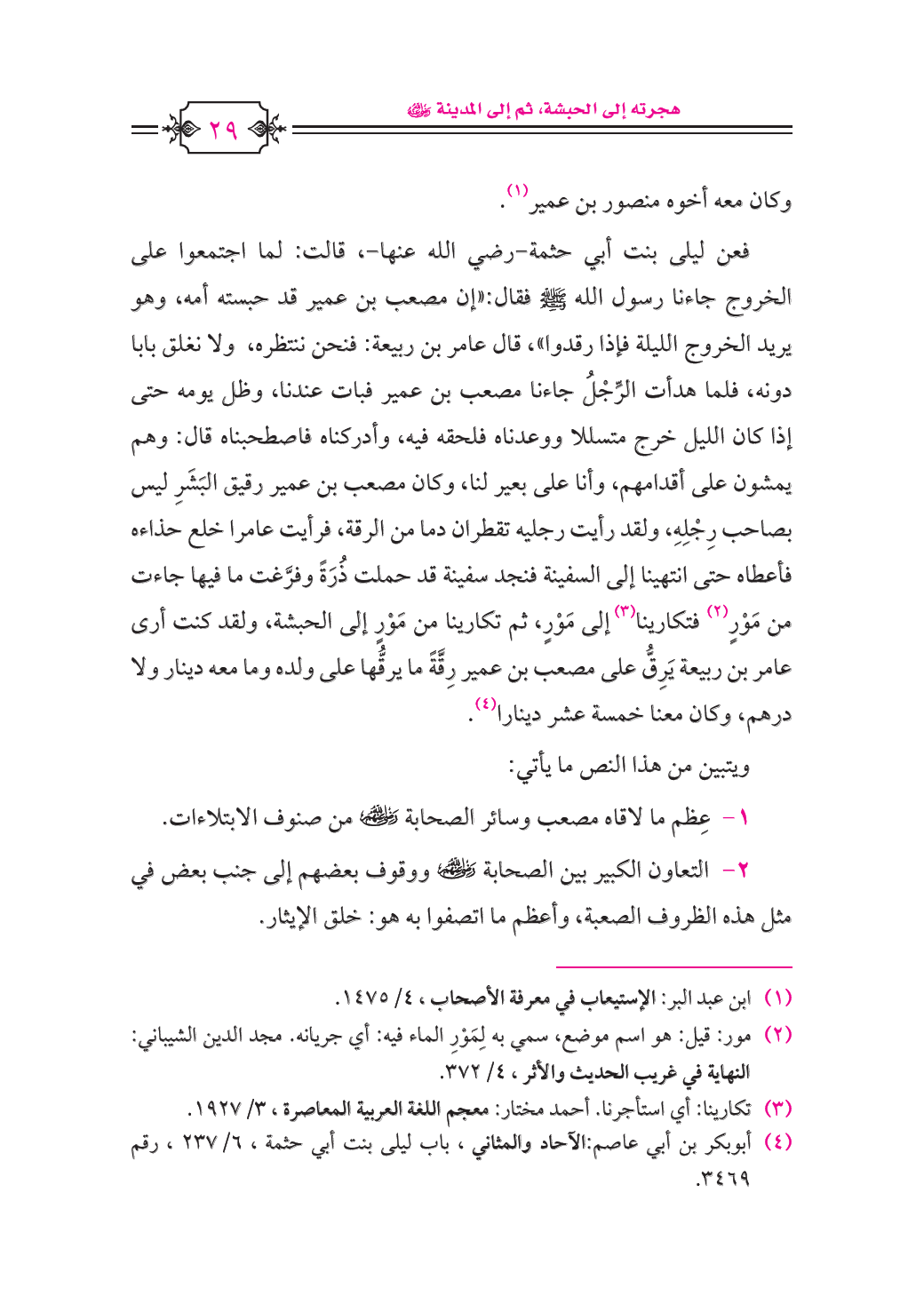 فعن ليلى بنت أبي حثمة -رضي الله عنها- , قالت: لما اجتمعوا على الخروج جاءنا رسول الله - صلى الله عليه وسلم - فقال: «إن مصعب بن عمير قد حبسته أمه , وهو يريد الخروج الليلة فإذا رقدوا» , قال عامر بن ربيعة: فنحن ننتظره , ولا نغلق بابا دونه , فلما هدأت الرِّجْلُ جاءنا مصعب بن عمير فبات عندنا , وظل يومه حتى إذا كان الليل خرج متسللا ووعدناه فلحقه فيه , وأدركناه فاصطحبناه قال: وهم يمشون على أقدامهم , وأنا على بعير لنا , وكان مصعب بن عمير رقيق البَشَرِ ليس بصاحب رِجْلِهِ , ولقد رأيت رجليه تقطران دما من الرقة , فرأيت عامرا خلع حذاءه فأعطاه حتى انتهينا إلى السفينة فنجد سفينة قد حملت ذُرَةً وفرَّغت ما فيها جاءت من مَوْرٍ (¬2) فتكارينا (¬3) إلى مَوْرٍ , ثم تكارينا من مَوْرٍ إلى الحبشة , ولقد كنت أرى عامر بن ربيعة يَرِقُّ على مصعب بن عمير رِقَّةً ما يرقُّها على ولده وما معه دينار ولا درهم , وكان معنا خمسة عشر دينارا (¬4).