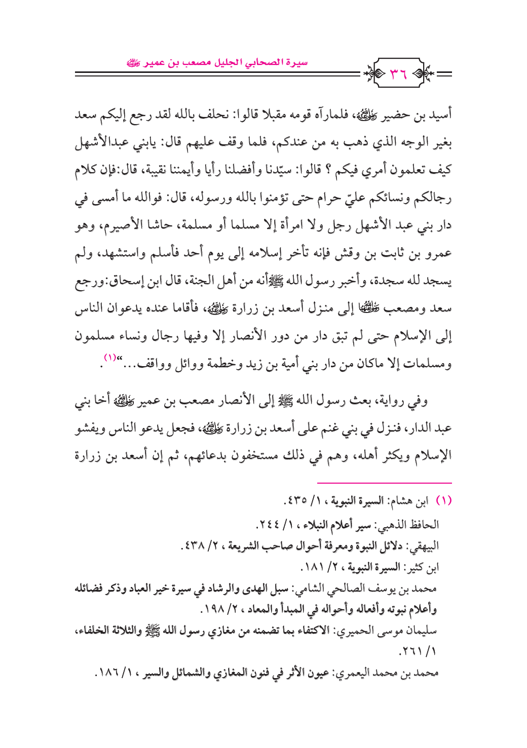 أسيد بن حضير - رضي الله عنه -، فلما رآه قومه مقبلا قالوا: نحلف بالله لقد رجع إليكم سعد بغير الوجه الذي ذهب به من عندكم , فلما وقف عليهم قال: يا بني عبد الأشهل كيف تعلمون أمري فيكم؟ قالوا: سيّدنا وأفضلنا رأيا وأيمننا نقيبة , قال: فإن كلام رجالكم ونسائكم عليّ حرام حتى تؤمنوا بالله ورسوله , قال: فو الله ما أمسى في دار بني عبد الأشهل رجل ولا امرأة إلا مسلما أو مسلمة، حاشا الأصيرم , وهو عمرو بن ثابت بن وقش فإنه تأخر إسلامه إلى يوم أحد فأسلم واستشهد , ولم يسجد لله سجدة، وأخبر رسول الله - صلى الله عليه وسلم - أنه من أهل الجنة , قال ابن إسحاق: ورجع سعد ومصعب رضي الله عنهما إلى منزل أسعد بن زرارة - رضي الله عنه -، فأقاما عنده يدعوان الناس إلى الإسلام حتى لم تبق دار من دور الأنصار إلا وفيها رجال ونساء مسلمون ومسلمات إلا ما كان من دار بني أمية بن زيد وخطمة ووائل وواقف ... " (¬1).