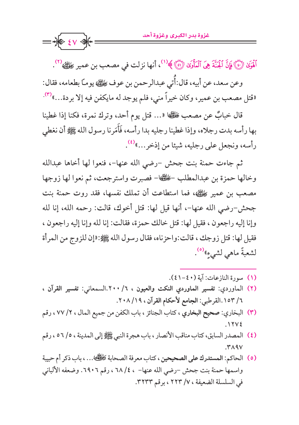 الْهَوَى (40) فَإِنَّ الْجَنَّةَ هِيَ الْمَأْوَى (41)} (¬1) , أنها نزلت في مصعب بن عمير - رضي الله عنه - (¬2).