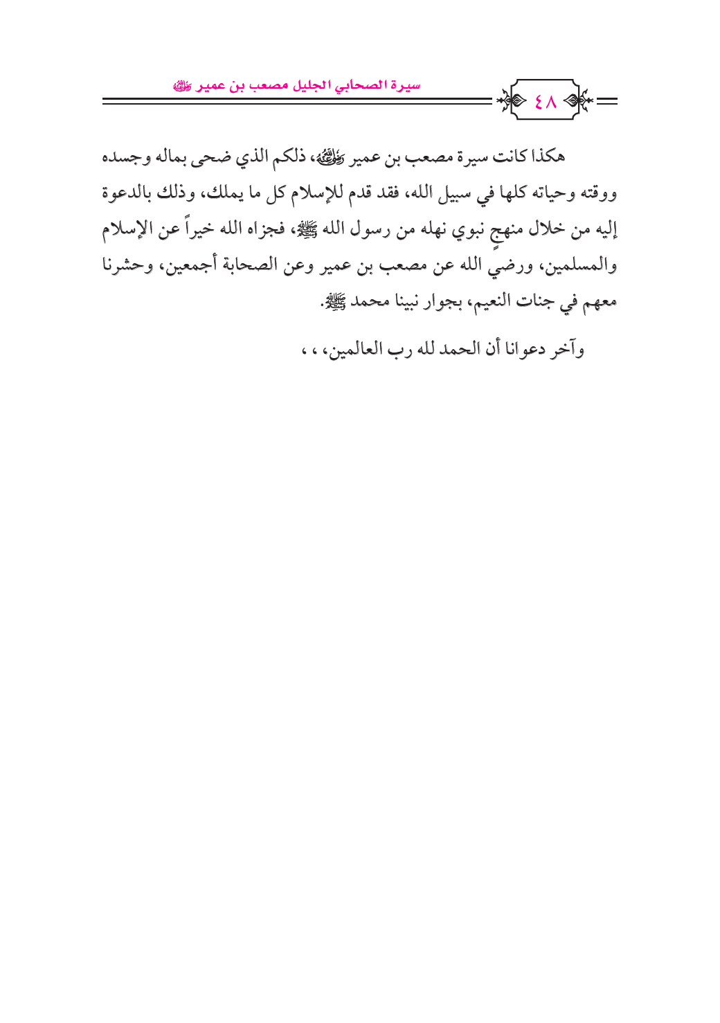 هكذا كانت سيرة مصعب بن عمير - رضي الله عنه - , ذلكم الذي ضحى بماله وجسده ووقته وحياته كلها في سبيل الله, فقد قدم للإسلام كل ما يملك, وذلك بالدعوة إليه من خلال منهجٍ نبوي نهله من رسول الله - صلى الله عليه وسلم - , فجزاه الله خيراً عن الإسلام والمسلمين , ورضي الله عن مصعب بن عمير وعن الصحابة أجمعين , وحشرنا معهم في جنات النعيم , بجوار نبينا محمد - صلى الله عليه وسلم -.