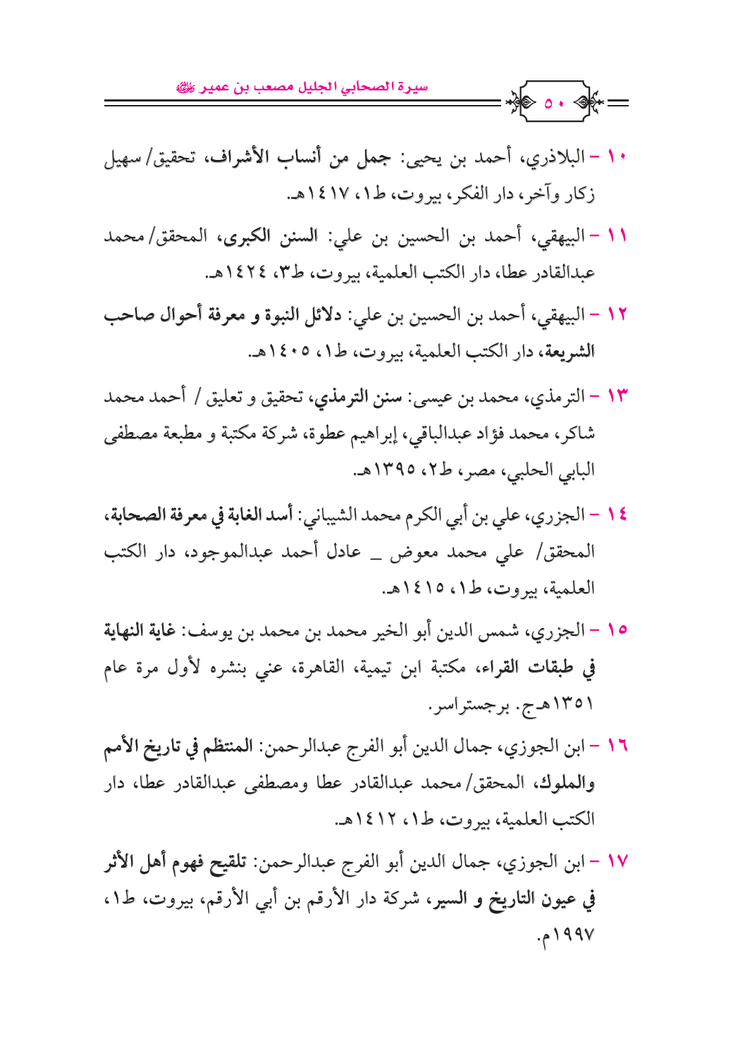 10) البلاذري , أحمد بن يحيى: جمل من أنساب الأشراف , تحقيق/سهيل زكار وآخر , دار الفكر , بيروت , ط1 , 1417هـ.