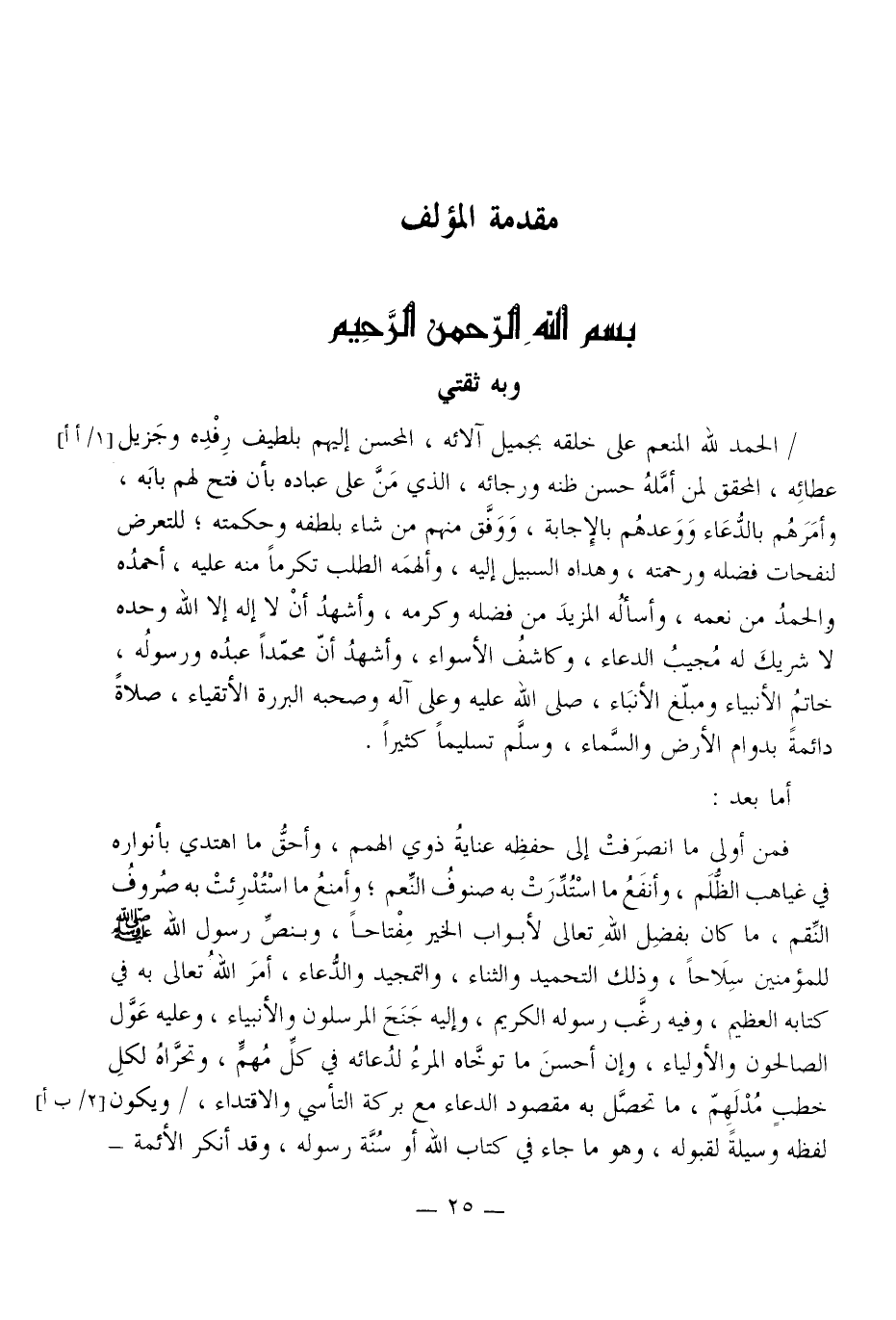 فَمن أولى مَا انصرفت إِلَى حفظه عناية ذَوي الهمم، وأحق مَا اهتدي بأنواره فِي غياهب الظُّلم، وأنفع مَا استدرت بِهِ صنوف النعم؛ وَأَمْنَع مَا استدرئت بِهِ صروف النقم، مَا كَانَ بِفضل الله تَعَالَى لأبواب الْخَيْر مفتاحا، وبنص رَسُول الله صلى الله عَلَيْهِ وَسلم للْمُؤْمِنين سِلَاحا، وَذَلِكَ التَّحْمِيد وَالثنَاء، والتمجيد وَالدُّعَاء، أَمر الله تَعَالَى بِهِ فِي كِتَابه الْعَظِيم، وَفِيه رغب رَسُوله الْكَرِيم، وَإِلَيْهِ جنح المُرْسَلُونَ والأنبياء، وَعَلِيهِ عول الصالحون والأولياء، وَإِن أحسن مَا توخاه الْمَرْء لدعائه فِي كل مُهِمّ، وتحراه لكل خطب مدلهم، مَا تحصل بِهِ مَقْصُود الدُّعَاء مَعَ بركَة التأسي والاقتداء، وَيكون لَفظه وَسِيلَة لقبوله، وَهُوَ مَا جَاءَ فِي كتاب الله أَو سنة رَسُوله، وَقد أنكر الْأَئِمَّة -