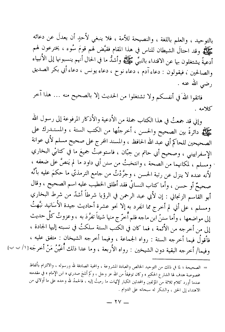 وَإِنِّي قد جمعت فِي هَذَا الْكتاب جملَة من الْأَدْعِيَة والأذكار المرفوعة إِلَى رَسُول الله صلى الله عَلَيْهِ وَسلم دَائِرَة بَين الصَّحِيح وَالْحسن، أخرجتها من الْكتب السِّتَّة، والمستدرك على الصَّحِيحَيْنِ للْحَاكِم أبي عبد الله الْحَافِظ، والمسند الْمخْرج على صَحِيح مُسلم لأبي عوَانَة الإسفرايين ي، وصحيح أبي حَاتِم بن حبَان، فاستوعبت جَمِيع مَا فِي كتابي البُخَارِيّ وَمُسلم، لمكانهما من الصِّحَّة، وانتخبت من سنَن أبي دَاوُد مَا لم ينص على ضعفه، لِأَنَّهُ عِنْده لَا ينزل عَن رُتْبَة الْحسن، وجردت من جَامع التِّرْمِذِيّ مَا حكم عَلَيْهِ بِأَنَّهُ صَحِيح أَو حسن، وَأما كتاب النَّسَائِيّ فقد أطلق الْخَطِيب عَلَيْهِ اسْم الصَّحِيح، وَقَالَ أَبُو الْقَاسِم الزنجاني: إِن لأبي عبد الرَّحْمَن فِي الرُّؤْيَا شرطا أَشد من شَرط البُخَارِيّ وَمُسلم، على أَنِّي لم أخرج مِمَّا انْفَرد بِهِ إِلَّا نَحْو عشرَة أَحَادِيث جَيِّدَة الْأَسَانِيد نبهت إِلَى موَاضعهَا، وَأما سنَن ابْن ماجة فَلم أخرج مِنْهَا شَيْئا تفرد بِهِ، وعزوت كل حَدِيث إِلَى من أخرجه من الْأَئِمَّة، فَمَا كَانَ فِي الْكتب السِّتَّة سلكت فِي نسبته إِلَيْهَا الجادة، فَأَقُول فِيمَا أخرجه السِّتَّة: رَوَاهُ الْجَمَاعَة، وَفِيمَا أخرجه الشَّيْخَانِ: مُتَّفق عَلَيْهِ، وَفِيمَا أخرجه الْبَقِيَّة دون الشَّيْخَيْنِ: رَوَاهُ الْأَرْبَعَة، وَمَا عدا ذَلِك أعين من أخرجه