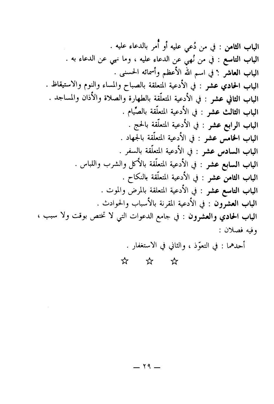 الْبَاب الْحَادِي وَالْعشْرُونَ: فِي جَامع الدَّعْوَات الَّتِي لَا تخْتَص بِوَقْت وَلَا سَبَب، وَفِيه فصلان: