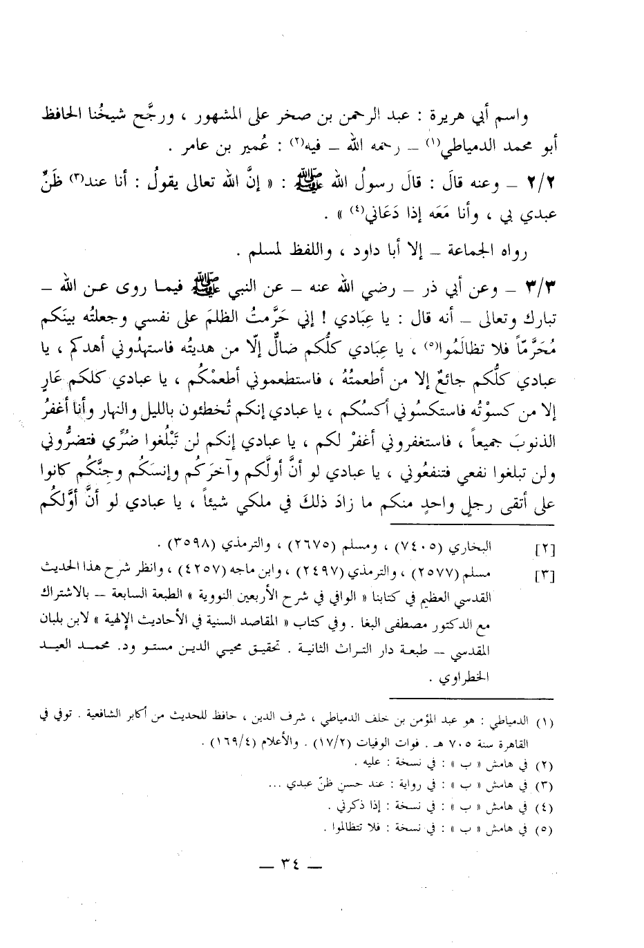 3 - وَعَن أبي ذَر رَضِي الله عَنهُ عَن النَّبِي صلى الله عَلَيْهِ وَسلم فِيمَا روى عَن الله تبَارك وَتَعَالَى أَنه قَالَ يَا عبَادي إِنِّي حرمت الظُّلم على نَفسِي وَجَعَلته بَيْنكُم محرما فَلَا تظالموا يَا عبَادي كلكُمْ ضال إِلَّا من هديته فاستهدوني أهدكم يَا عبَادي كلكُمْ جَائِع إِلَّا من أطعمته فاستطعموني أطْعمكُم يَا عبَادي كلكُمْ عَار إِلَّا من كسوته فاستكسوني أكسكم يَا عبَادي إِنَّكُم تخطئون بِاللَّيْلِ وَالنَّهَار وَأَنا أَغفر الذُّنُوب جَمِيعًا فاستغفروني أَغفر لكم يَا عبَادي إِنَّكُم لن تبلغوا ضري فتضروني وَلنْ تبلغوا نفعي فتنفعوني يَا عبَادي لَو أَن أولكم وآخركم وإنسكم وجنكم كَانُوا على أتقى رجل وَاحِد مِنْكُم مَا زَاد ذَلِك فِي ملكي شَيْئا يَا عبَادي لَو أَن أولكم
