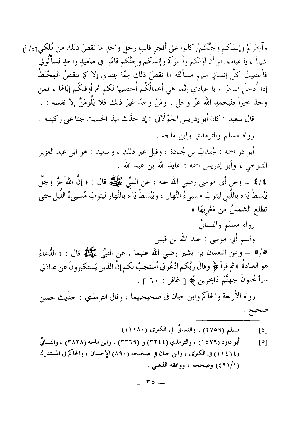 5 - وَعَن النُّعْمَان بن بشير رَضِي الله عَنْهُمَا عَن النَّبِي صلى الله عَلَيْهِ وَسلم قَالَ (الدُّعَاء هُوَ الْعِبَادَة) ثمَّ قَرَأَ {وَقَالَ ربكُم ادْعُونِي أَسْتَجِب لكم إِن الَّذين يَسْتَكْبِرُونَ عَن عبادتي سيدخلون جَهَنَّم داخرين} غَافِر 60