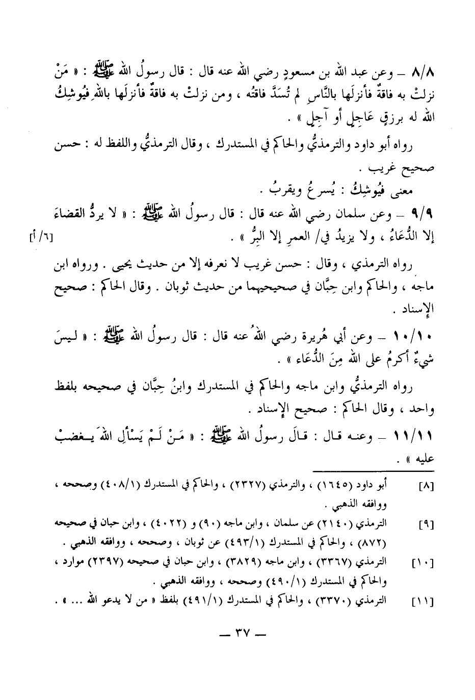 9 - / 9 وَعَن سلمَان رَضِي الله عَنهُ قَالَ قَالَ رَسُول الله صلى الله عَلَيْهِ وَسلم (لَا يرد الْقَضَاء إِلَّا الدُّعَاء وَلَا يزِيد فِي الْعُمر إِلَّا الْبر)