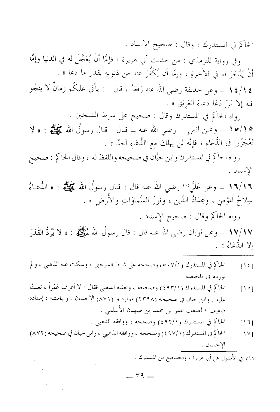 17 - وَعَن ثَوْبَان رَضِي الله عَنهُ قَالَ قَالَ رَسُول الله صلى الله عَلَيْهِ وَسلم (لَا يرد الْقدر إِلَّا الدُّعَاء)