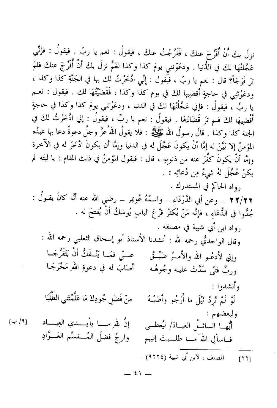 22 - وَعَن أبي الدَّرْدَاء واسْمه عُوَيْمِر رَضِي الله عَنهُ أَنه كَانَ يَقُول جدوا فِي الدُّعَاء فَإِنَّهُ من يكثر قرع الْبَاب يُوشك أَن يفتح لَهُ