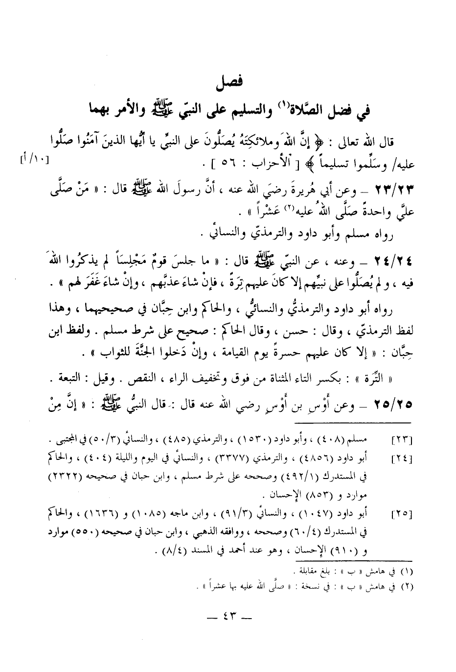 23 - وَعَن أبي هُرَيْرَة رَضِي الله عَنهُ أَن رَسُول الله صلى الله عَلَيْهِ وَسلم قَالَ من صلى عَليّ وَاحِدَة صلى الله عَلَيْهِ عشرا)