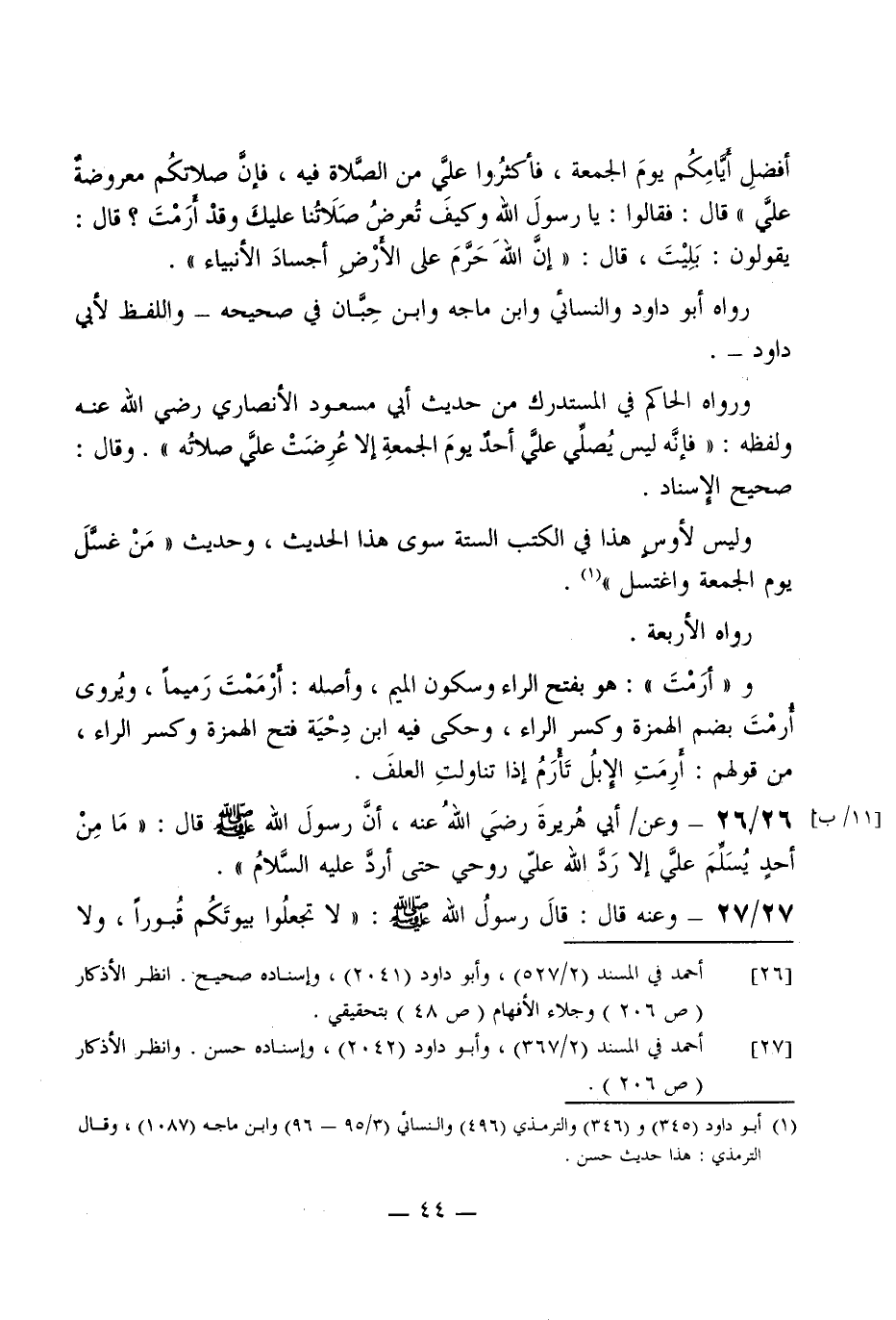أفضل أيامكم يَوْم الْجُمُعَة فَأَكْثرُوا عَليّ من الصَّلَاة فِيهِ فَإِن صَلَاتكُمْ معروضة عَليّ) قَالَ فَقَالُوا يَا رَسُول الله وَكَيف تعرض صَلَاتنَا عَلَيْك وَقد أرمت قَالَ يَقُولُونَ بليت قَالَ (إِن الله حرم على الأَرْض أجساد الْأَنْبِيَاء)