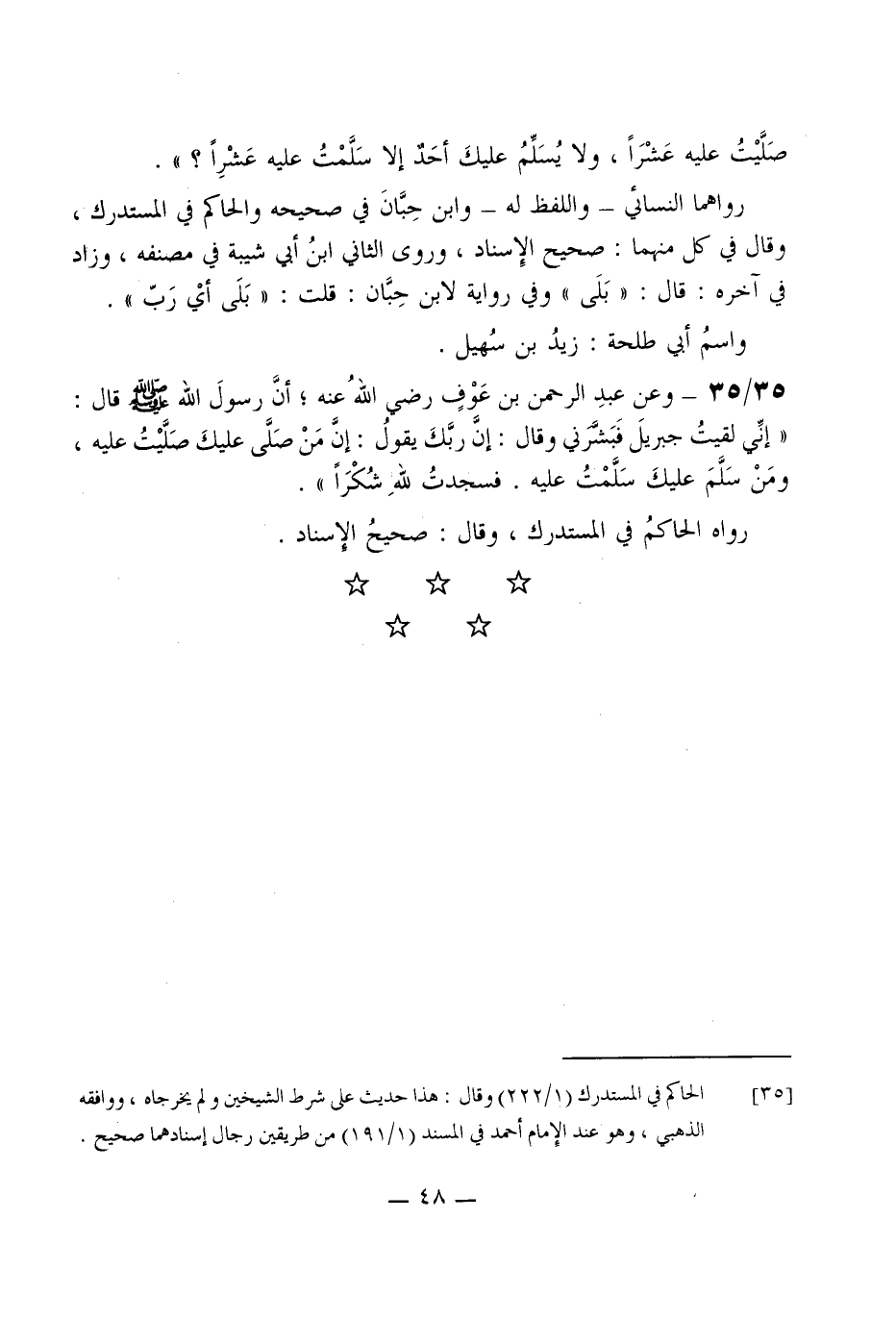 35 - وَعَن عبد الرَّحْمَن بن عَوْف رَضِي الله عَنهُ أَن رَسُول الله صلى الله عَلَيْهِ وَسلم قَالَ (إِنِّي لقِيت جِبْرِيل فبشرني وَقَالَ إِن رَبك يَقُول إِن من صلى عَلَيْك صليت عَلَيْهِ وَمن سلم عَلَيْك سلمت عَلَيْهِ فسجدت لله شكرا)