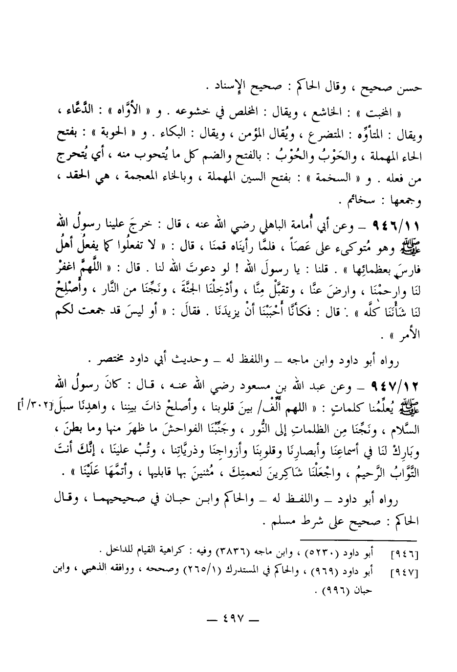 947 - وَعَن عبد الله بن مَسْعُود رَضِي الله عَنهُ قَالَ كَانَ رَسُول الله صلى الله عَلَيْهِ وَسلم يعلمنَا كَلِمَات (اللَّهُمَّ ألف بَين قُلُوبنَا وَأصْلح ذَات بَيْننَا واهدنا سبل السَّلَام ونجنا من الظُّلُمَات إِلَى النُّور وجنبنا الْفَوَاحِش مَا ظهر مِنْهَا وَمَا بطن وَبَارك لنا فِي أسماعنا وأبصارنا وقلوبنا وَأَزْوَاجنَا وَذُرِّيَّاتنَا وَتب علينا إِنَّك أَنْت التواب الرَّحِيم واجعلنا شاكرين لنعمتك مثنين بهَا قابليها وأتمها علينا)