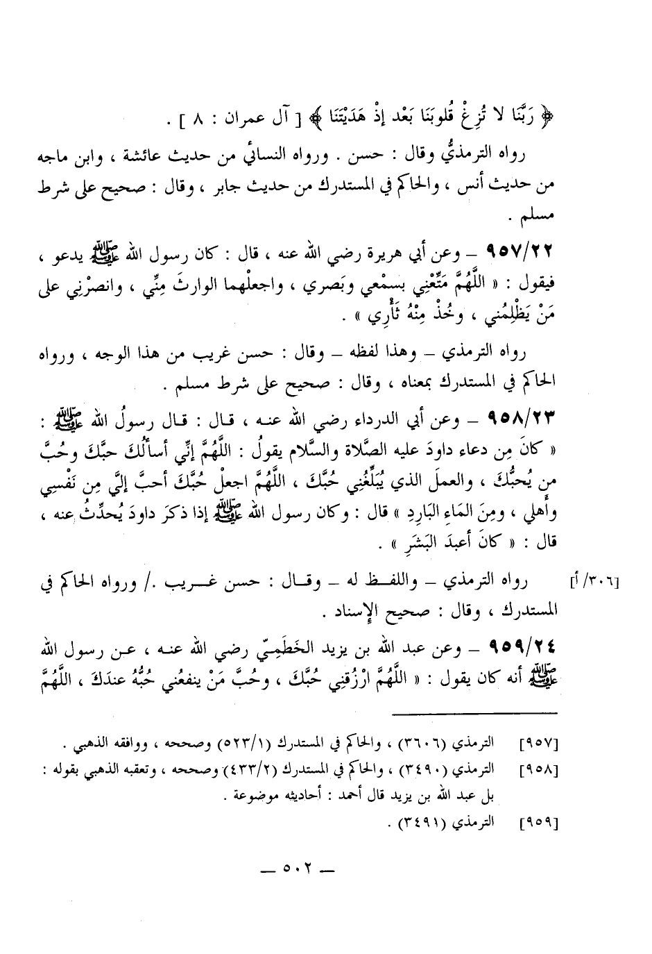 958 - وَعَن أبي الدَّرْدَاء رَضِي الله عَنهُ قَالَ قَالَ رَسُول الله صلى الله عَلَيْهِ وَسلم (كَانَ من دُعَاء دَاوُد عَلَيْهِ الصَّلَاة وَالسَّلَام يَقُول (اللَّهُمَّ إِنِّي أَسأَلك حبك وَحب من يحبك وَالْعَمَل الَّذِي يبلغنِي حبك اللَّهُمَّ اجْعَل حبك أحب إِلَيّ من نَفسِي وَأَهلي وَمن المَاء الْبَارِد) قَالَ وَكَانَ رَسُول الله صلى الله عَلَيْهِ وَسلم إِذا ذكر دَاوُد يحدث عَنهُ قَالَ (كَانَ أعبد الْبشر)