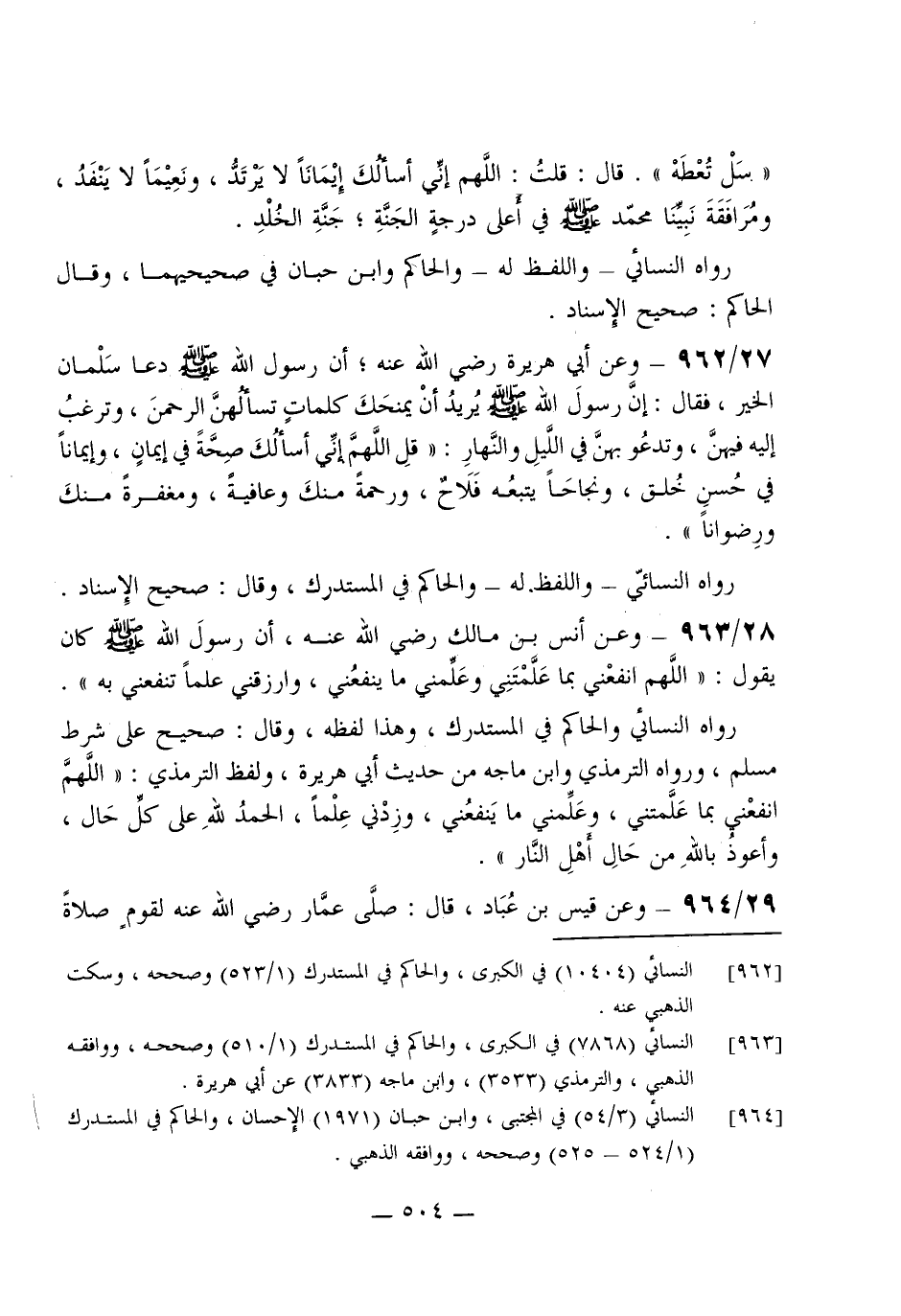 962 - وَعَن أبي هُرَيْرَة رَضِي الله عَنهُ أَن رَسُول الله صلى الله عَلَيْهِ وَسلم دَعَا سلمَان الْخَيْر فَقَالَ إِن رَسُول الله صلى الله عَلَيْهِ وَسلم يُرِيد أَن يمنحك كَلِمَات تسألهن الرَّحْمَن وترغب إِلَيْهِ فِيهِنَّ وَتَدْعُو بِهن فِي اللَّيْل وَالنَّهَار (قل اللَّهُمَّ إِنِّي أَسأَلك صِحَة فِي إِيمَان وإيمانا فِي حسن خلق ونجاحا يتبعهُ فلاح وَرَحْمَة مِنْك وعافية ومغفرة مِنْك ورضوانا)