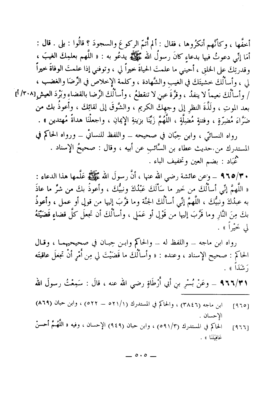 أخفها وَكَأَنَّهُم أنكروها فَقَالَ ألم أتم الرُّكُوع وَالسُّجُود قَالُوا بلَى قَالَ أما إِنِّي دَعَوْت فِيهَا بِدُعَاء كَانَ رَسُول الله صلى الله عَلَيْهِ وَسلم يَدْعُو بِهِ (اللَّهُمَّ بعلمك الْغَيْب وقدرتك على الْخلق أحيني مَا علمت الْحَيَاة خيرا لي وتوفني إِذا علمت الْوَفَاة خيرا لي وَأَسْأَلك خشيتك فِي الْغَيْب وَالشَّهَادَة وَكلمَة الْإِخْلَاص فِي الرِّضَا وَالْغَضَب وَأَسْأَلك نعيما لَا ينْفد وقرة عين لَا تَنْقَطِع وَأَسْأَلك الرِّضَا بِالْقضَاءِ وَبرد الْعَيْش بعد الْمَوْت وَلَذَّة النّظر إِلَى وَجهك الْكَرِيم والشوق إِلَى لقائك وَأَعُوذ بك من ضراء مضرَّة وفتنة مضلة اللَّهُمَّ زينا بزينة الْإِيمَان واجعلنا هداة مهتدين)