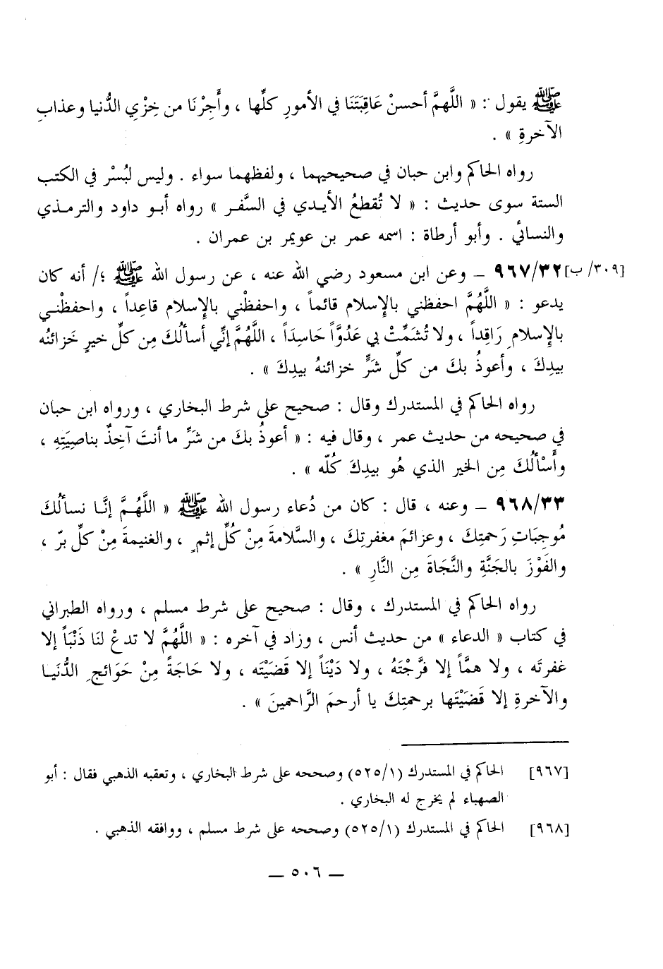 967 - وَعَن ابْن مَسْعُود رَضِي الله عَنهُ عَن رَسُول الله صلى الله عَلَيْهِ وَسلم أَنه كَانَ يَدْعُو (اللَّهُمَّ احفظني بِالْإِسْلَامِ قَائِما واحفظني بِالْإِسْلَامِ قَاعِدا واحفظني بِالْإِسْلَامِ رَاقِدًا وَلَا تشمت بِي عدوا حَاسِدًا اللَّهُمَّ إِنِّي أَسأَلك من كل خير خزائنه بِيَدِك وَأَعُوذ بك من كل شَرّ خزائنه بِيَدِك)