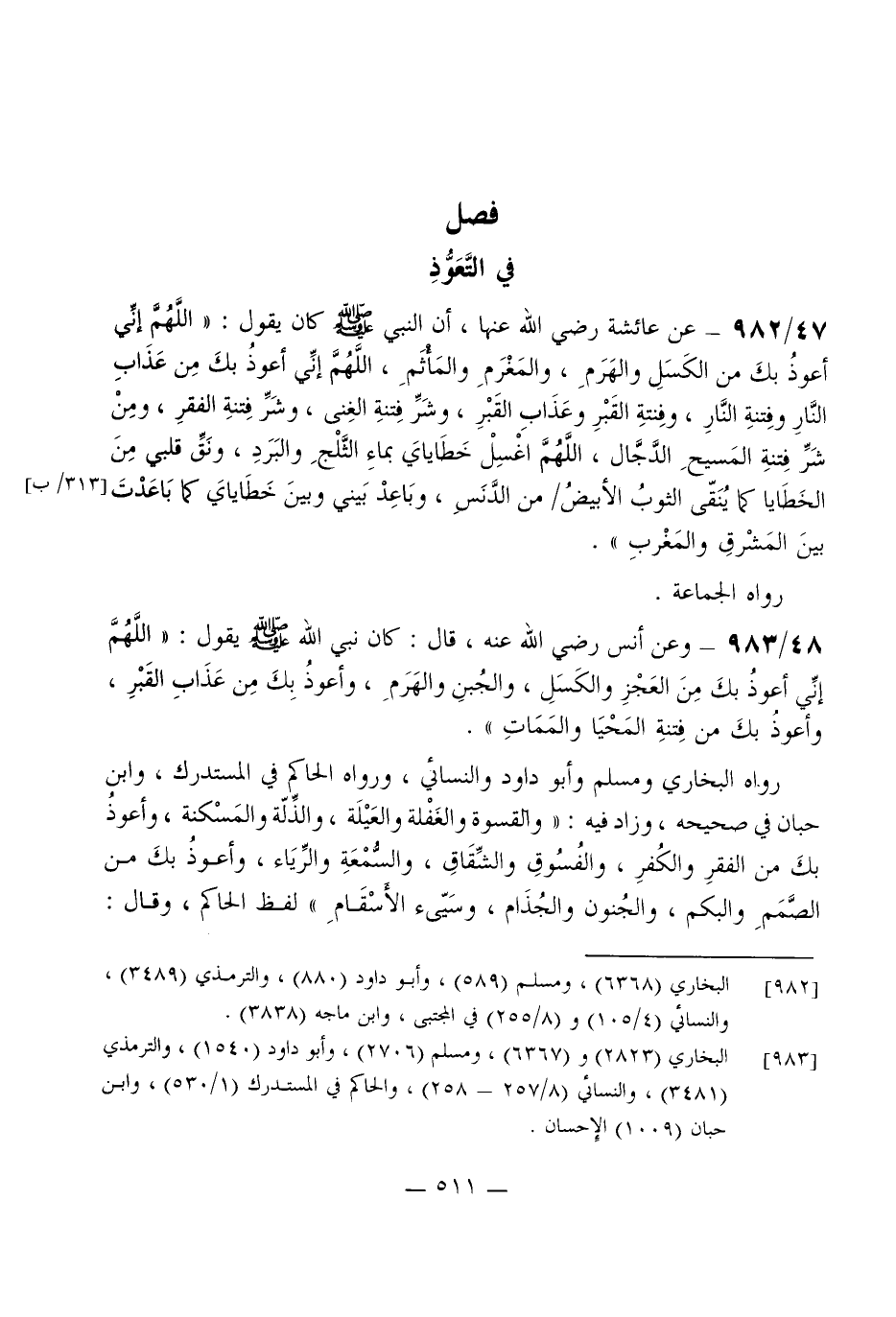 982 - عَن عَائِشَة رَضِي الله عَنْهَا أَن النَّبِي صلى الله عَلَيْهِ وَسلم كَانَ يَقُول (اللَّهُمَّ إِنِّي أعوذ بك من الكسل والهرم والمغرم والمأثم اللَّهُمَّ إِنِّي أعوذ بك من عَذَاب النَّار وفتنة النَّار وفتنة الْقَبْر وَعَذَاب الْقَبْر وَشر فتْنَة الْغنى وَشر فتْنَة الْفقر وَمن شَرّ فتْنَة الْمَسِيح الدَّجَّال اللَّهُمَّ اغسل خطاياي بِمَاء الثَّلج وَالْبرد ونق قلبِي من الْخَطَايَا كَمَا ينقى الثَّوْب الْأَبْيَض من الدنس وباعد بيني وَبَين خطاياي كَمَا باعدت بَين الْمشرق وَالْمغْرب)