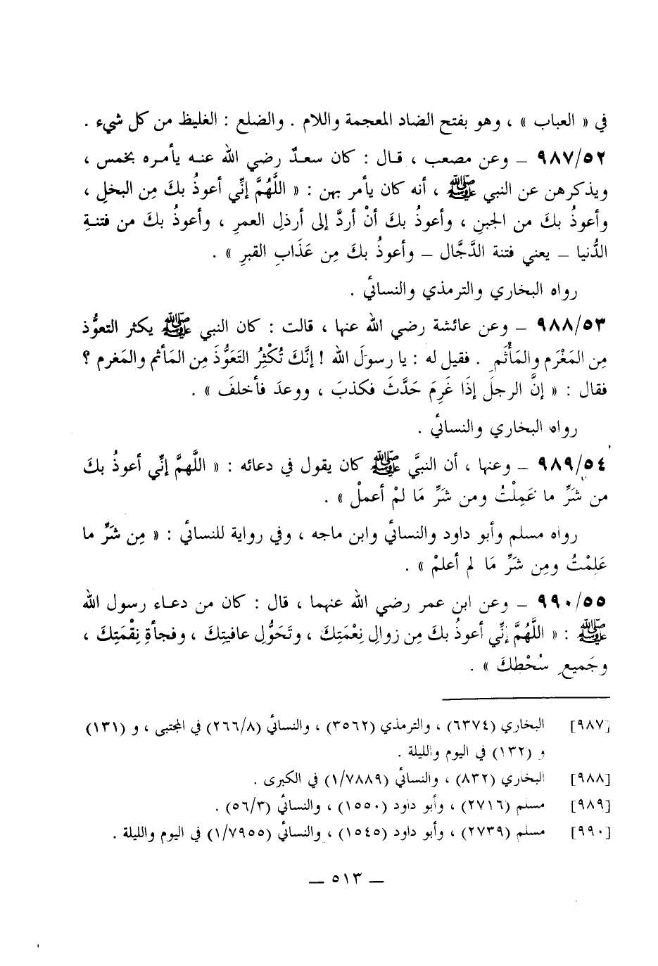 990 - وَعَن ابْن عمر رَضِي الله عَنْهُمَا قَالَ كَانَ من دُعَاء رَسُول الله صلى الله عَلَيْهِ وَسلم (اللَّهُمَّ إِنِّي أعوذ بك من زَوَال نِعْمَتك وتحول عافيتك وفجأة نقمتك وَجَمِيع سخطك)