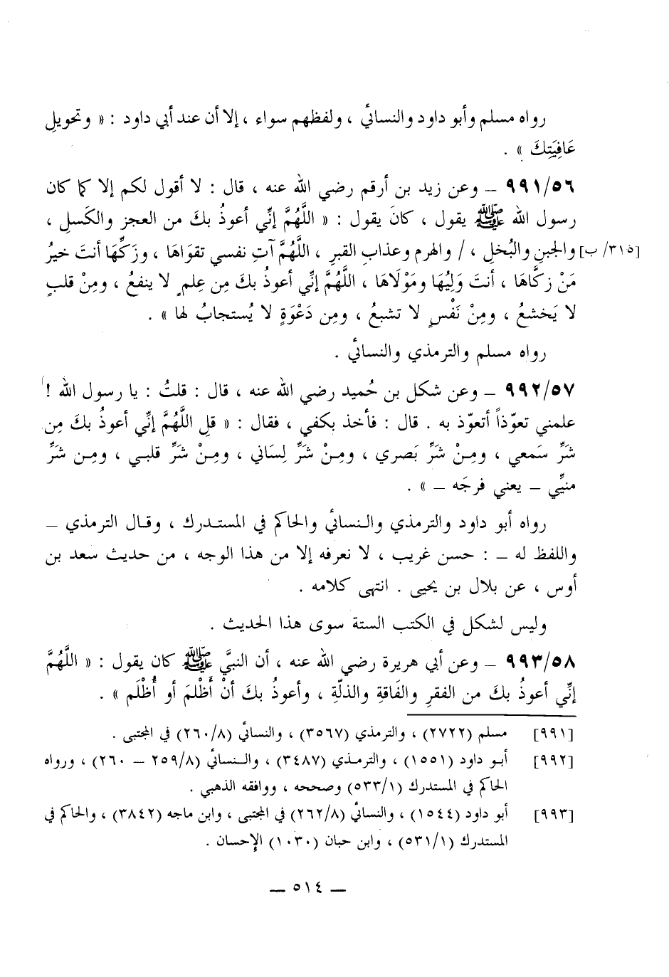 991 - وَعَن زيد بن أَرقم رَضِي الله عَنهُ قَالَ لَا أَقُول لكم إِلَّا كَمَا كَانَ رَسُول الله صلى الله عَلَيْهِ وَسلم يَقُول كَانَ يَقُول (اللَّهُمَّ إِنِّي أعوذ بك من الْعَجز والكسل والجبن وَالْبخل والهرم وَعَذَاب الْقَبْر اللَّهُمَّ آتٍ نَفسِي تقواها وزكها أَنْت خير من زكاها أَنْت وَليهَا ومولاها اللَّهُمَّ إِنِّي أعوذ بك من علم لَا ينفع وَمن قلب لَا يخشع وَمن نفس لَا تشبع وَمن دَعْوَة لَا يُسْتَجَاب لَهَا)