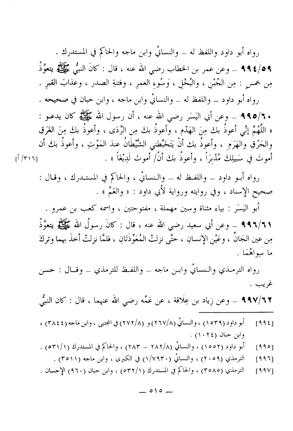 995 - وَعَن أبي الْيُسْر رَضِي الله عَنهُ أَن رَسُول الله صلى الله عَلَيْهِ وَسلم كَانَ يَدْعُو (اللَّهُمَّ إِنِّي أعوذ بك من الْهدم وَأَعُوذ بك من الردى وَأَعُوذ بك من الْغَرق والحرق والهرم وَأَعُوذ بك أَن يتخبطني الشَّيْطَان عِنْد الْمَوْت وَأَعُوذ بك أَن أَمُوت فِي سَبِيلك مُدبرا وَأَعُوذ بك أَن أَمُوت لديغا)