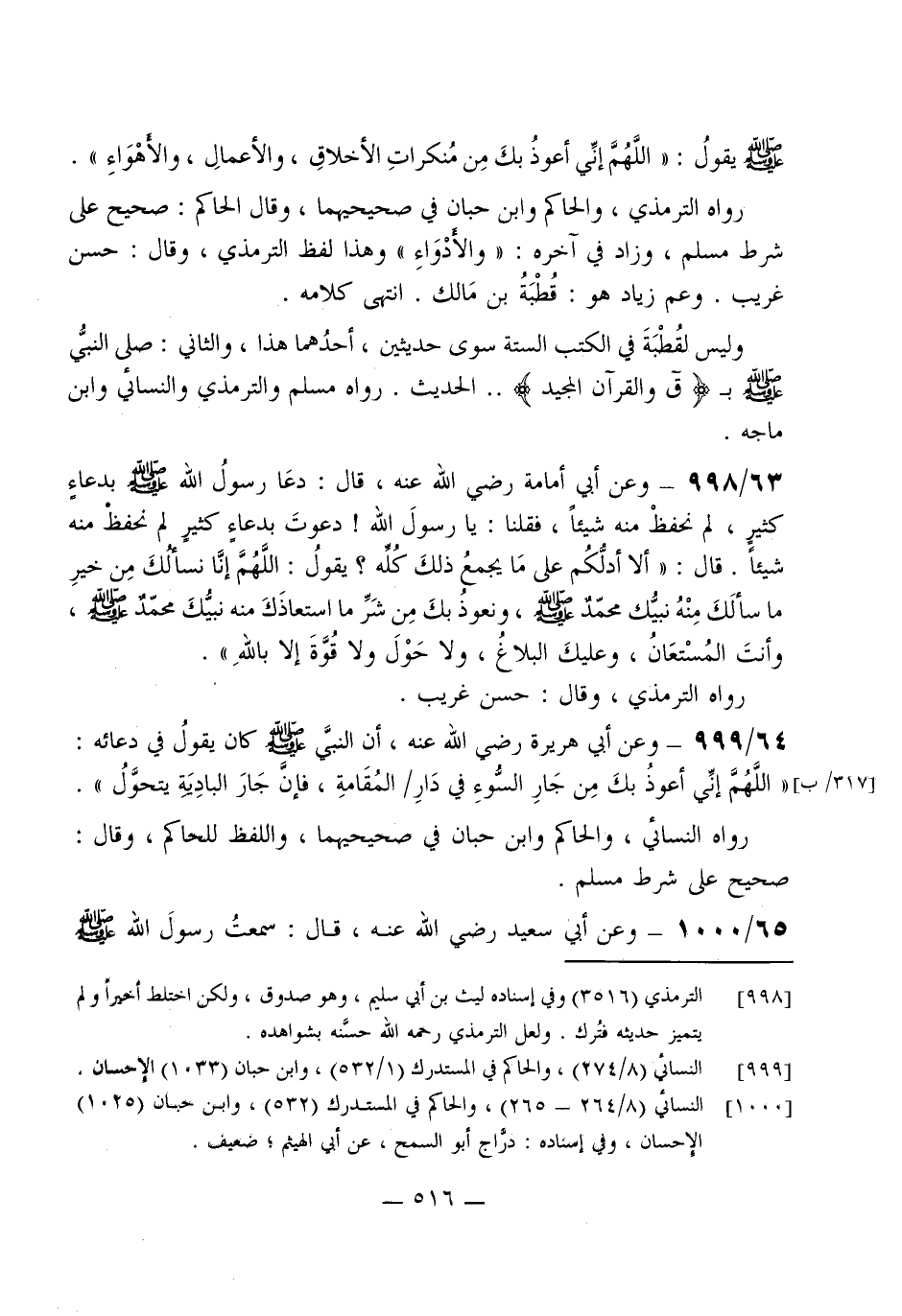 998 - وَعَن أبي أُمَامَة رَضِي الله عَنهُ قَالَ دَعَا رَسُول الله صلى الله عَلَيْهِ وَسلم بِدُعَاء كثير لم نَحْفَظ مِنْهُ شَيْئا فَقُلْنَا يَا رَسُول الله دَعَوْت بِدُعَاء كثير لم نَحْفَظ مِنْهُ شَيْئا قَالَ (أَلا أدلكم على مَا يجمع ذَلِك كُله يَقُول اللَّهُمَّ إِنَّا نَسْأَلك من خير مَا سَأَلَك مِنْهُ نبيك مُحَمَّد صلى الله عَلَيْهِ وَسلم ونعوذ بك من شَرّ مَا استعاذك مِنْهُ نبيك مُحَمَّد صلى الله عَلَيْهِ وَسلم وَأَنت الْمُسْتَعَان وَعَلَيْك الْبَلَاغ وَلَا حول وَلَا قُوَّة إِلَّا بِاللَّه)