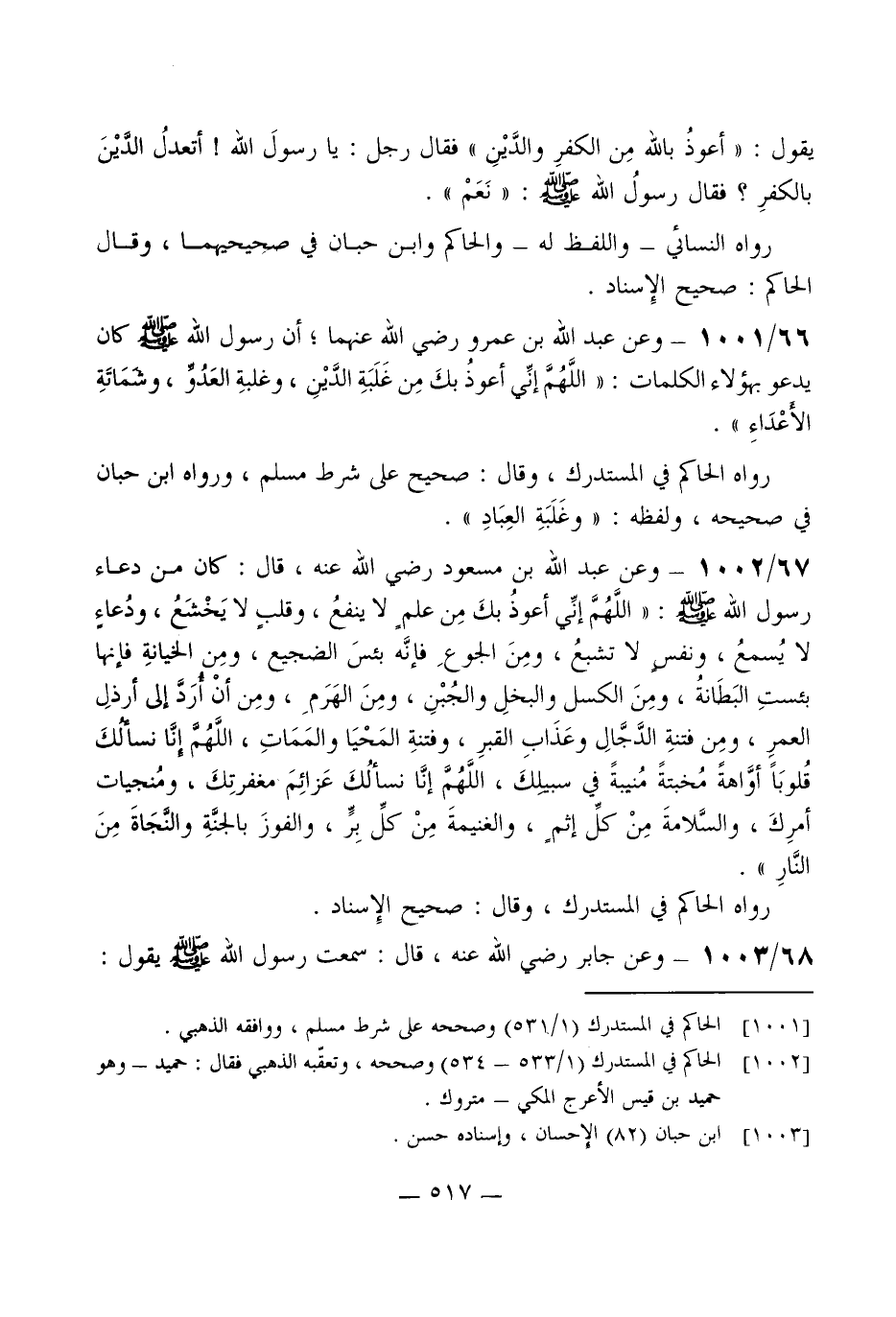 1001 - وَعَن عبد الله بن عَمْرو رَضِي الله عَنْهُمَا أَن رَسُول الله صلى الله عَلَيْهِ وَسلم كَانَ يَدْعُو بهؤلاء الْكَلِمَات (اللَّهُمَّ إِنِّي أعوذ بك من غَلَبَة الدّين وَغَلَبَة الْعَدو وشماتة الْأَعْدَاء)