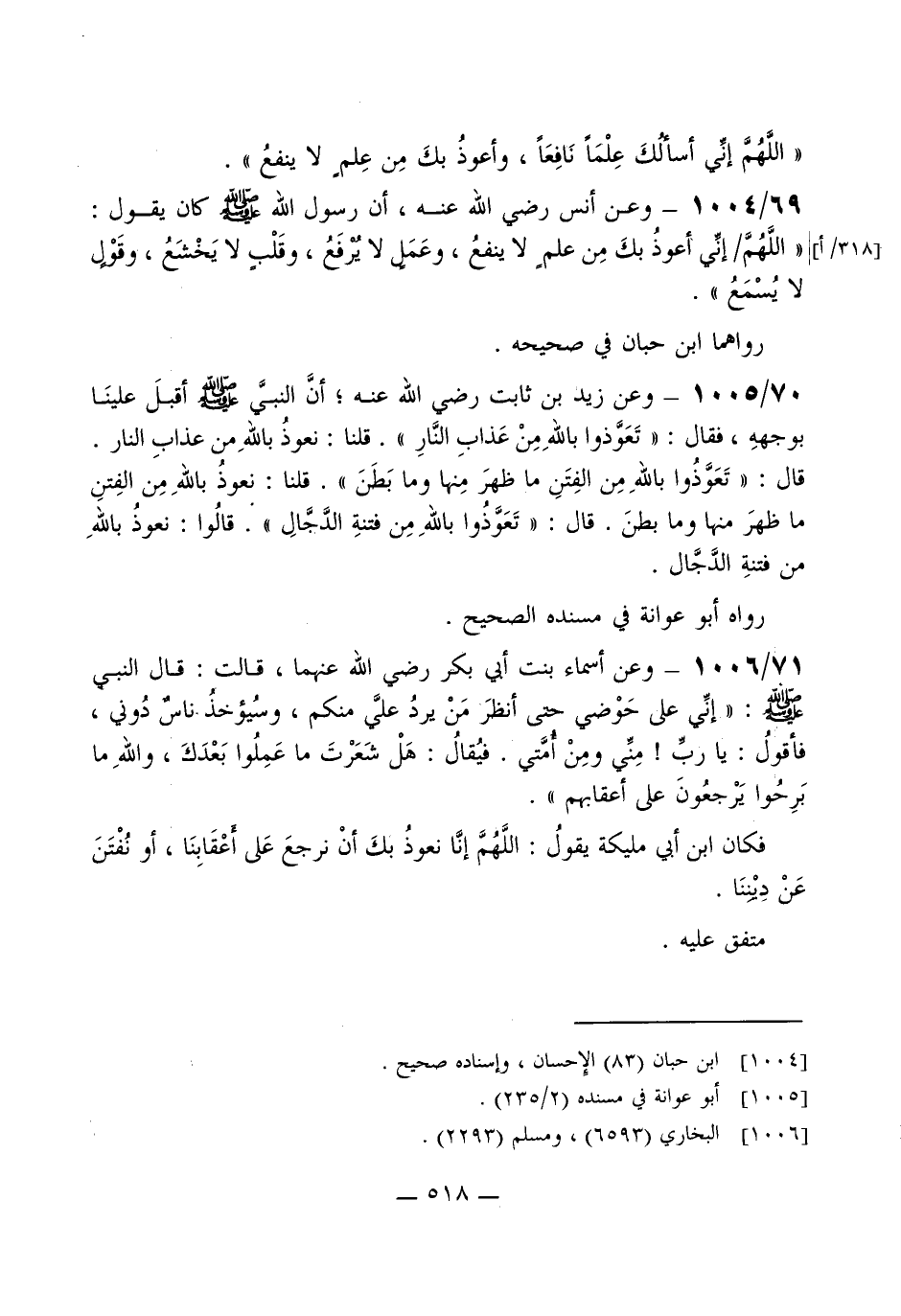1005 - وَعَن زيد بن ثَابت رَضِي الله عَنهُ أَن النَّبِي صلى الله عَلَيْهِ وَسلم أقبل علينا بِوَجْهِهِ فَقَالَ (تعوذوا بِاللَّه من عَذَاب النَّار) قُلْنَا نَعُوذ بِاللَّه من عَذَاب النَّار قَالَ (تعوذوا بِاللَّه من الْفِتَن مَا ظهر مِنْهَا وَمَا بطن) قُلْنَا نَعُوذ بِاللَّه من الْفِتَن مَا ظهر مِنْهَا وَمَا بطن قَالَ (تعوذوا بِاللَّه من فتْنَة الدَّجَّال) قَالُوا نَعُوذ بِاللَّه من فتْنَة الدَّجَّال