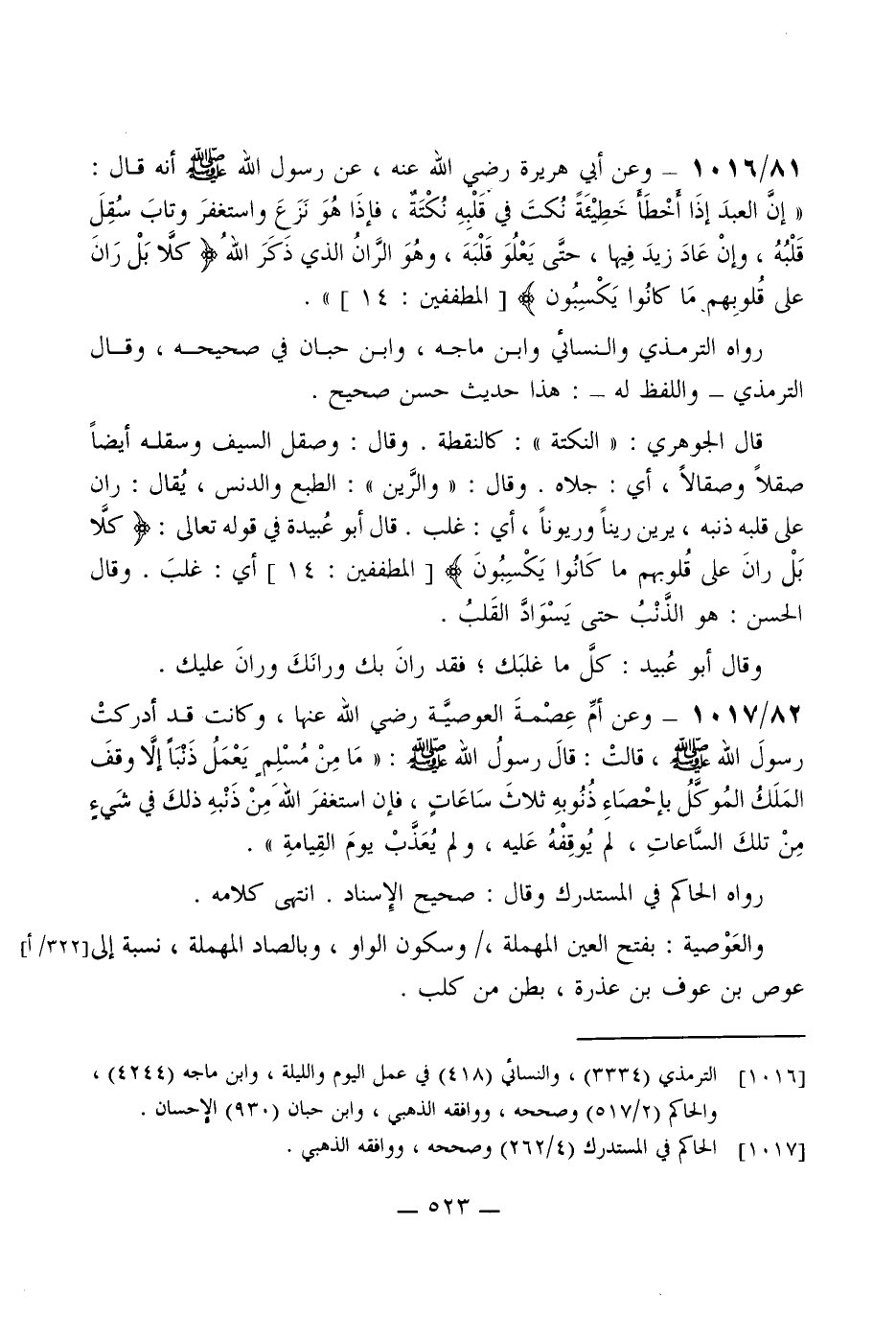 1016 - وَعَن أبي هُرَيْرَة رَضِي الله عَنهُ عَن رَسُول الله صلى الله عَلَيْهِ وَسلم أَنه قَالَ (إِن العَبْد إِذا أَخطَأ خَطِيئَة نكت فِي قلبه نُكْتَة فَإِذا هُوَ نزع واستغفر وَتَابَ سقل قلبه وَإِن عَاد زيد فِيهَا حَتَّى يَعْلُو قلبه وَهُوَ الران الَّذِي ذكر الله {كلا بل ران على قُلُوبهم مَا كَانُوا يَكْسِبُونَ} المطففين 14)