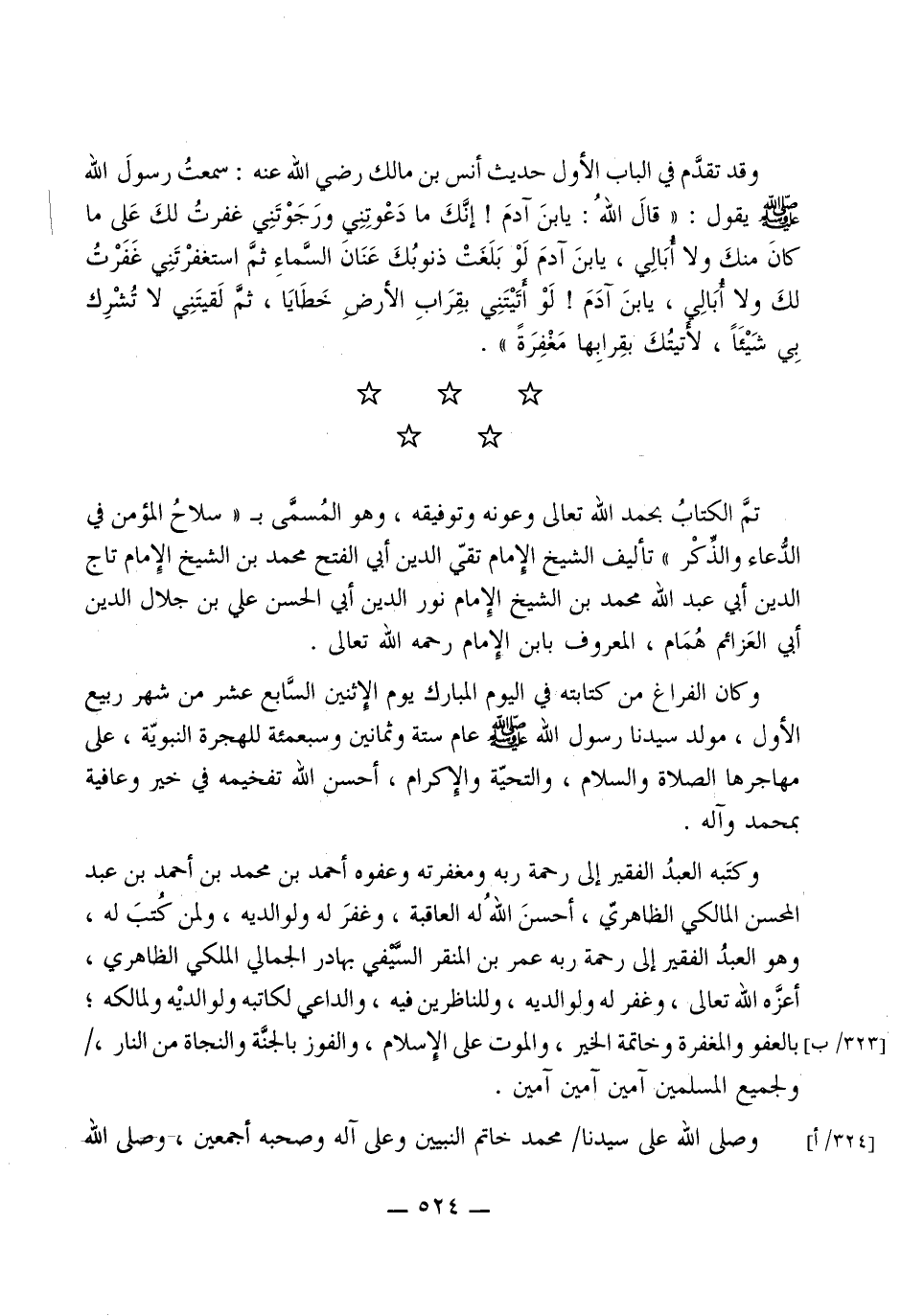 تمّ الْكتاب بِحَمْد الله تَعَالَى وعونه وتوفيقه وَهُوَ الْمُسَمّى ب سلَاح الْمُؤمن فِي الدُّعَاء وَالذكر تأليف الشَّيْخ الإِمَام تَقِيّ الدّين أبي الْفَتْح مُحَمَّد بن الشَّيْخ الإِمَام تَاج الدّين أبي عبد الله مُحَمَّد بن الشَّيْخ الإِمَام نور الدّين أبي الْحسن عَليّ بن جلال الدّين أبي العزائم همام الْمَعْرُوف بِابْن الإِمَام رَحمَه الله تَعَالَى