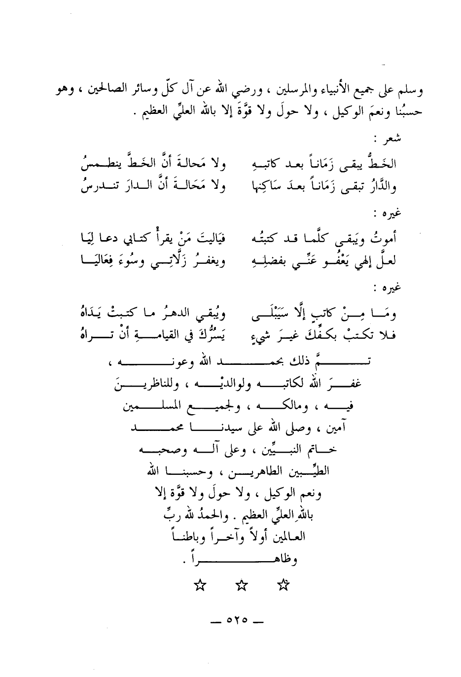 تمّ ذَلِك بِحَمْد الله وعونه غفر الله لكَاتبه ولوالديه وللناظرين فِيهِ ومالكه وَلِجَمِيعِ الْمُسلمين آمين وَصلى الله على سيدنَا مُحَمَّد خَاتم النَّبِيين وعَلى آله وَصَحبه الطيبين الطاهرين وحسبنا الله وَنعم الْوَكِيل وَلَا حول وَلَا قُوَّة إِلَّا بِاللَّه الْعلي الْعَظِيم وَالْحَمْد لله رب الْعَالمين أَولا وآخرا وَبَاطنا وظاهرا