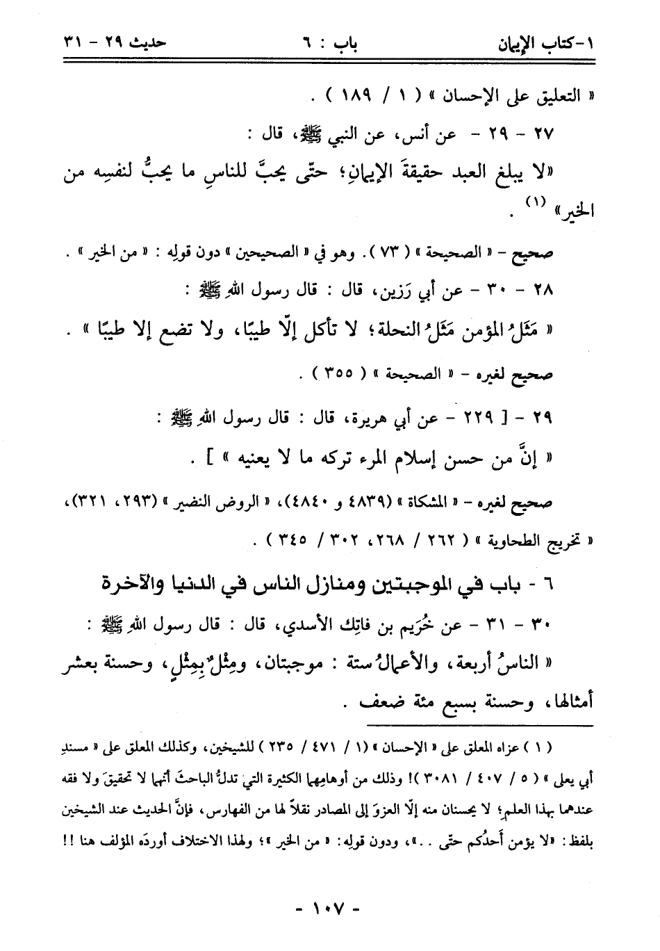 (¬1) عزاه المعلق على "الإحسان" (1/ 471/ 235) للشيخين، وكذلك المعلق على "مسندِ أبي يعلى" (5/ 407/ 3081)! وذلك من أوهامِهما الكثيرة التي تدلُّ الباحثَ أنهما لا تحقيقَ ولا فقه عندهما بهذا العلم؛ لا يحسنان منه إلّا العزوَ إلى المصادر نقلاً لها من الفهارس، فإنَّ الحديث عند الشيخين بلفظ: "لا يؤمن أَحدُكم حتّى .. "، ودون قولِه: "من الخير"؛ ولهذا الاختلاف أوردَه المؤلف هنا!!