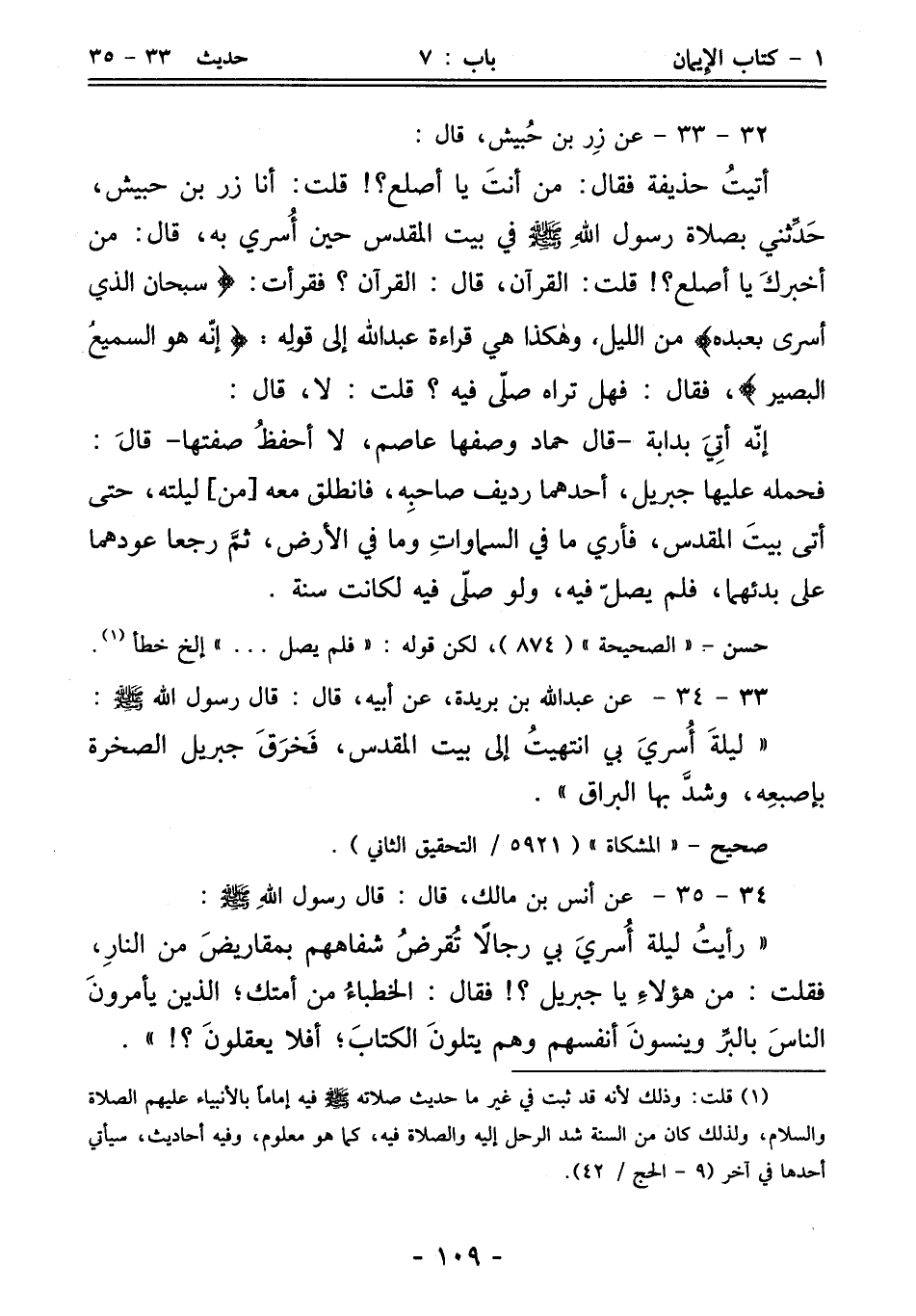 أتيتُ حذيفة فقال: من أنتَ يا أصلع؟! قلت: أنا زر بن حبيش، حَدِّثني بصلاة رسول اللهِ - صلى الله عليه وسلم - في بيت المقدس حين أُسري به، قال: من أخبركَ يا أصلع؟! قلت: القرآن، قال: القرآن؟ فقرأت: {سبحان الذي أسرى بعبده} من الليل، وهكذا هي قراءة عبد الله إلى قولِه: {إنّه هو السميعُ البصير}، فقال: فهل تراه صلّى فيه؟ قلت: لا، قال: