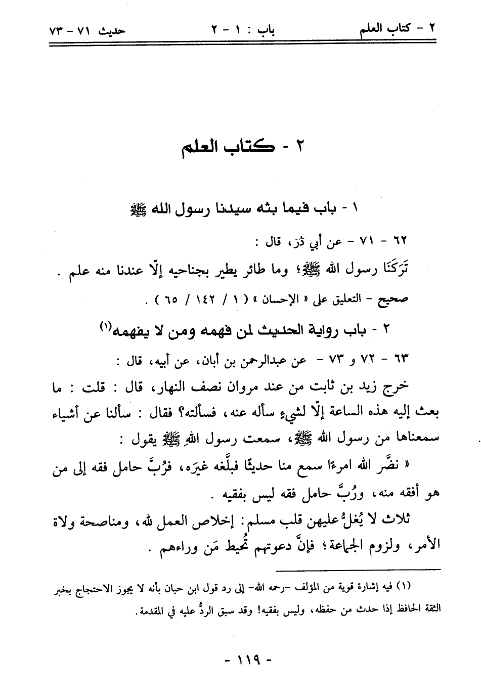"نضَّر الله امرءًا سمع منا حديثًا فبلَّغه غيرَه، فرُبَّ حامل فقه إلى من هو أفقه منه، ورُبَّ حامل فقه ليس بفقيه.