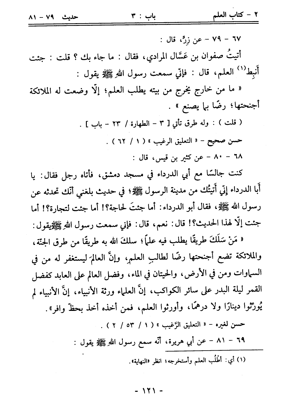 "ما من خارج يخرج من بيته يطلب العلم؛ إلّا وضعت له الملائكة أجنحتها؛ رضًا بما يصنع".