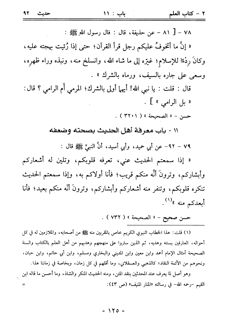 (¬1) قلت: هذا الخطاب النبوي الكريم خاص بالمقربين منه - صلى الله عليه وسلم - من أصحابه، والملازمين له في كل أحواله، العارفين بسنته وهديه، ثم الذين ساروا على منهجهم وهديهم من أهل العلم بالكتاب والسنة الصحيحة أمثال الإمام أحمد وابن معين وابن المديني والبخاري ومسلم، وابن أبي حاتم، وابن حبان، ونحوهم من الأئمة النقاد؛ كالذهبي والعسقلاني، وما أقلهم في كل زمان، وبخاصة في زماننا هذا.