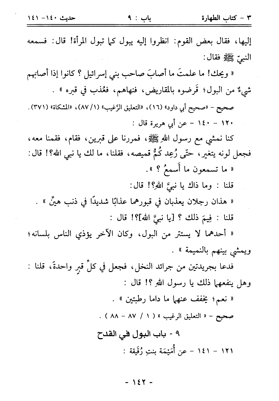"ويحك! ما علمتَ ما أصابَ صاحب بني إسرائيل؟ كانوا إذا أصابَهم شيءٌ من البول؛ قَرضوه بالمقاريض، فنهاهم، فعُذب في قبره".