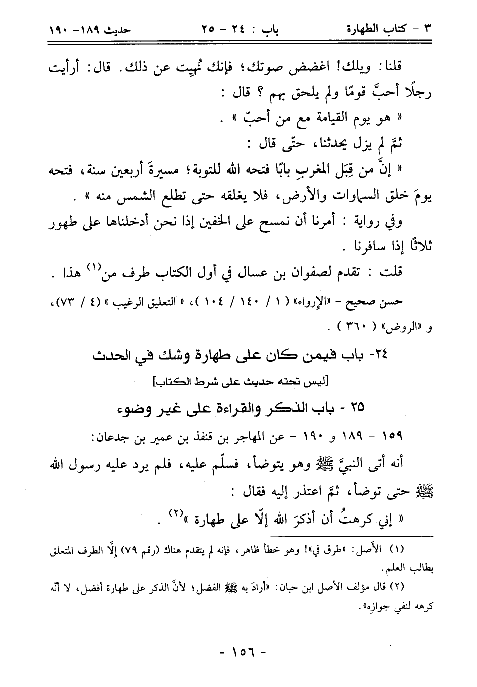 (¬2) قال مؤلف الأصل ابن حبان: "أرادَ به - صلى الله عليه وسلم - الفضل؛ لأنَّ الذكر على طهارة أفضل، لا أنّه كرهه لنفي جوازِه".